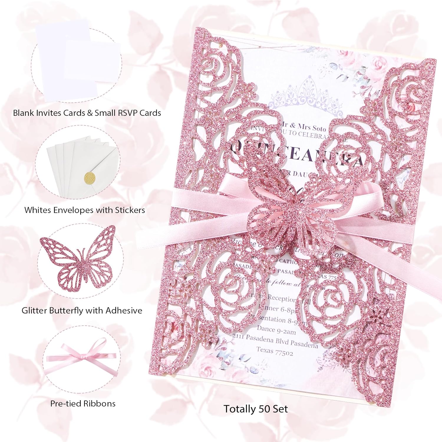 50PCS Pink Wedding Invitations Butterfly Laser Cut Invitation with Envelopes and Rsvp Card Personalized Inner Sheets for Wedding Bridal Baby Shower QuinceañEra Engagement Birthday