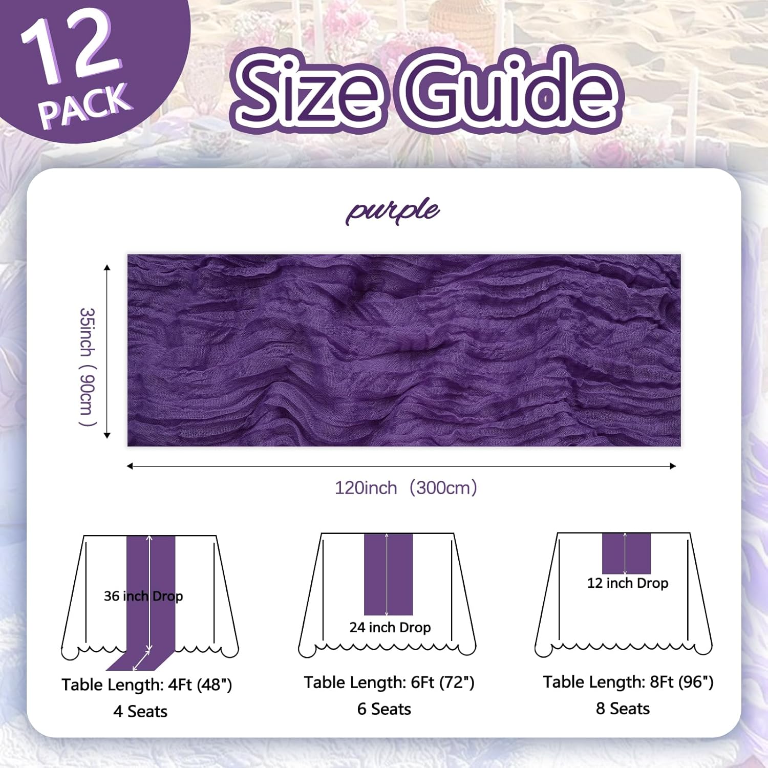 12 Pack Purple Cheesecloth Table Runner 10ft Boho Gauze Fabric Cheese Cloth Table Runner 35 x 120 Inch Rustic Sheer Runner for Romantic Wedding Decor Baby Shower Party Table Centerpiece Decoration