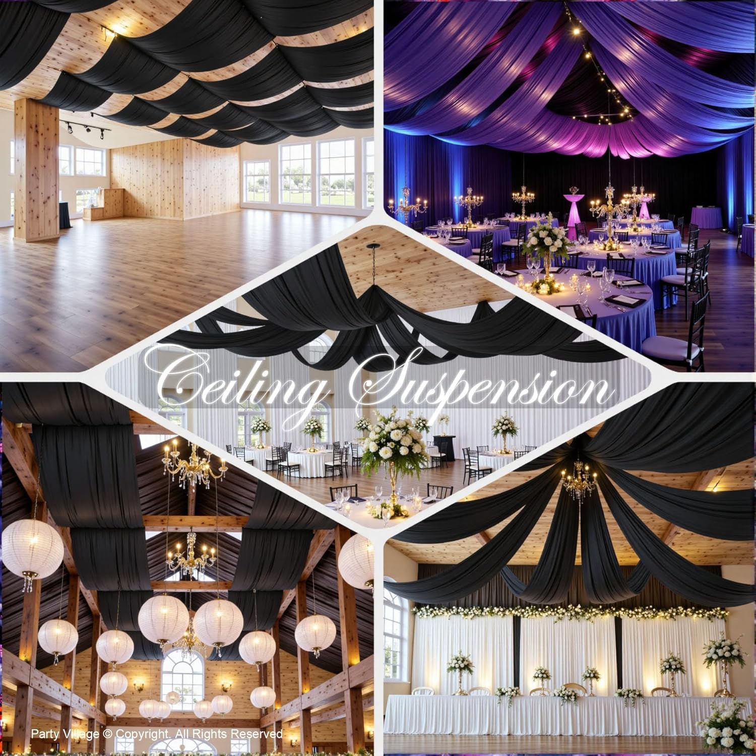 • 💐【Black Ceiling Drapes】The package will include 8 panels Black wedding drape curtain(without hanging pieces), each wedding extra long curtain measures 5 feet (60inch)wide x30 feet(360inch) long.The sufficient quantity can meet your demands for decorating your weddings, parties, receptions, and these Black ceiling drapes will create a delicate and aesthetic sense to your wedding ceiling decoration and light up every banquet.