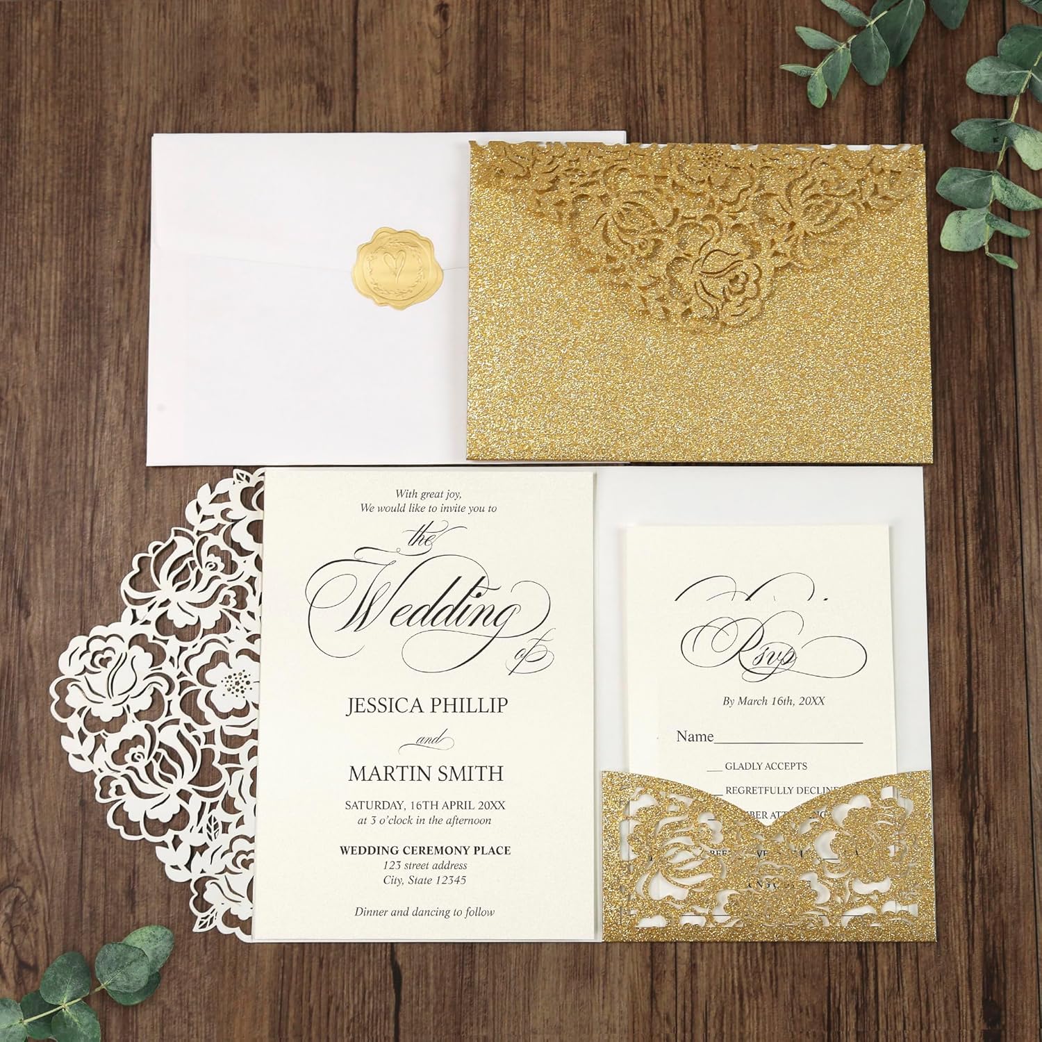 DORIS HOME 50pcs Laser Cut Wedding Invitation Pockets with Envelopes Gold Glitter, 5.12" x 7.12"Invitation Cards for Wedding, Anniversary (No Inserts Included)