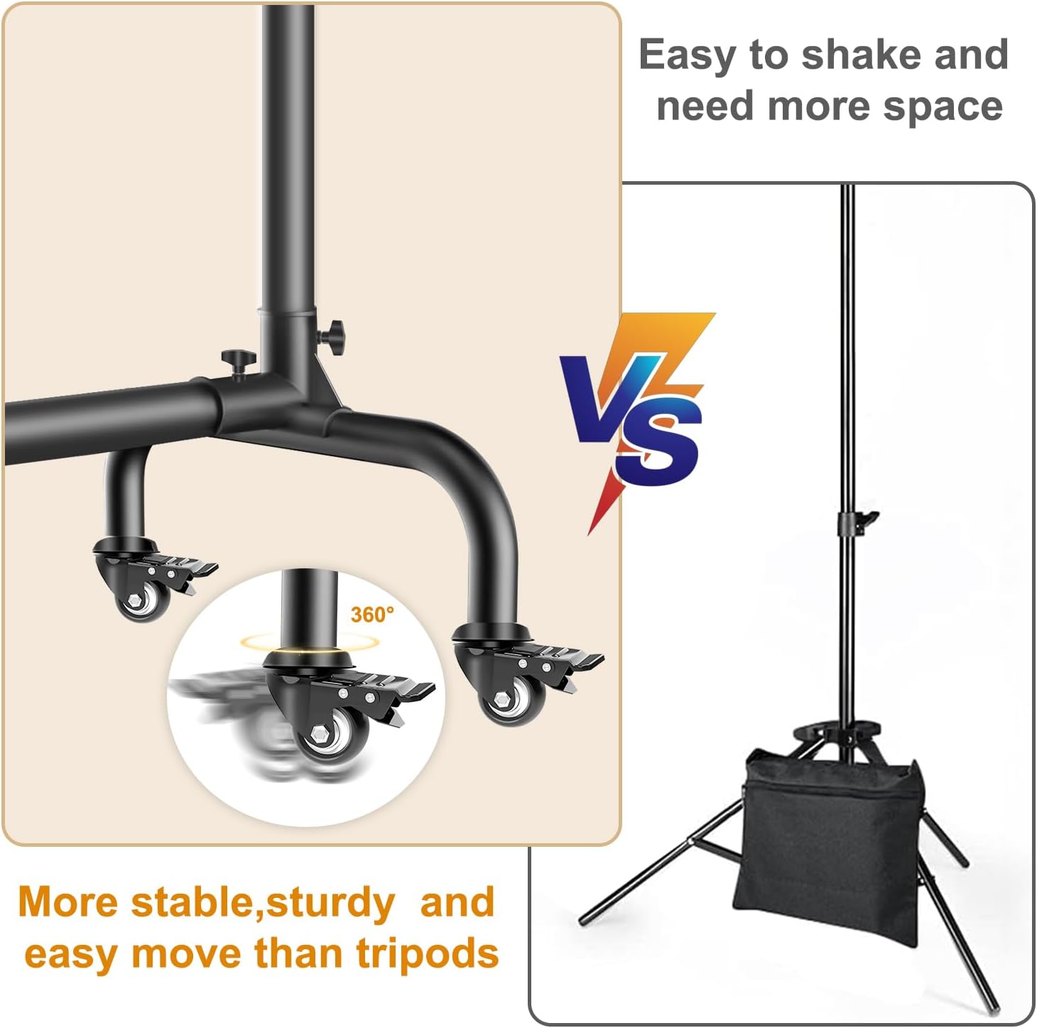 • EASY TO ASSEMBLE - The photo backdrop stand is easy to assemble, all connections can be manually attached or detached. No additional tools are required. Each caster has a brake to keep it in place. If you need to move it, just turn on the brake and drag it back and forth, no more struggling to move the heavy background.
