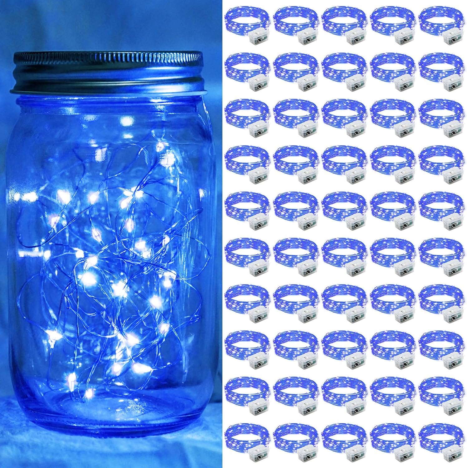 50 Pack Blue Fairy Lights 7Ft 20 LED Twinkle String Lights 3 Modes Battery Operated Waterproof Firefly Starry for Mason Jar Party Wedding Christmas Valentines Day Table Centerpieces