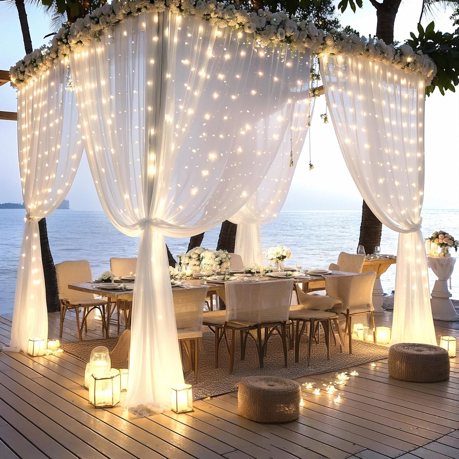 • White Tulle Backdrop Curtain with Lights String: Each set includes 2 pieces of 5x10ft sheer white tulle curtains, a 10 ft warm white LED light string, and 12 clips. Perfect for weddings, baby showers, and birthday parties, this backdrop creates a romantic and enchanting atmosphere, making every moment unforgettable