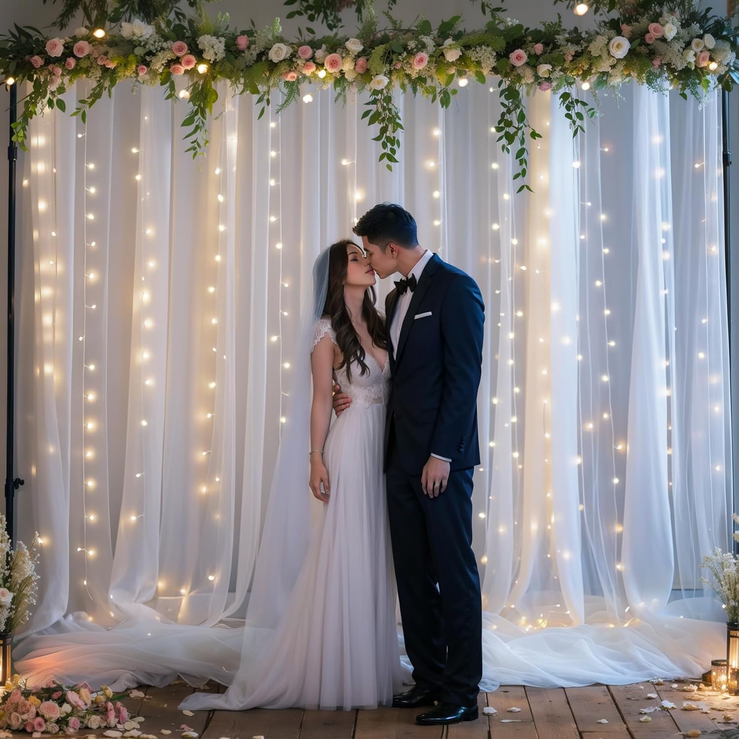 • Backdrop Curtains with Lights: Each set includes 4 pieces of 5x8ft white sheer tulle backdrop curtains, 2 sets of 10 ft warm white LED string lights, and 24 clips. These sheer curtains with lights are perfect for wedding photo booths or wedding reception backdrops, bringing a romantic and charming atmosphere to evening events