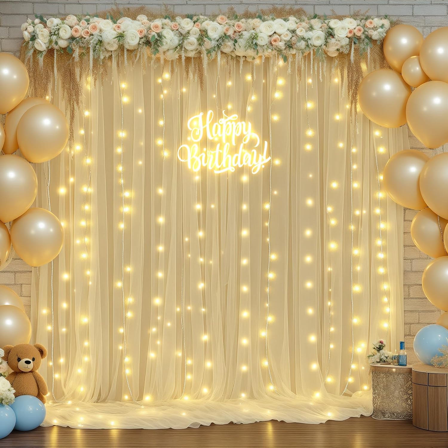 • Champagne Sheer Backdrop Curtain with Lights Occasions: Perfect for weddings, baby showers, bridal showers, birthday parties, anniversaries, New Year celebrations, family gatherings, and other occasions to create a memorable photo backdrop. The tulle backdrop curtains can be reused many times. For a fuller effect, consider purchasing multiple sets to use together