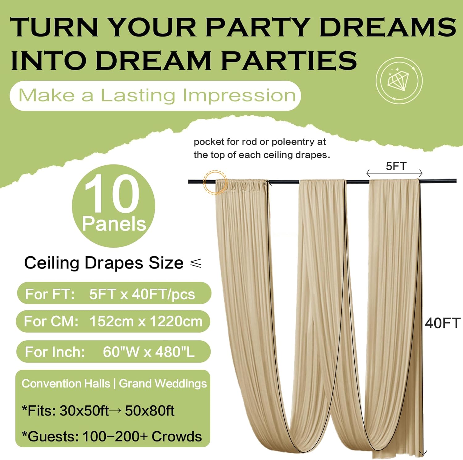 • 40ft Extra Long Ceiling Drapes: 10 Panels 5ftx40ft Beige Backdrop Curtains for Parties. Totally 50FT(Width) x 40FT(Height). cortinas para fiestas decoracion.