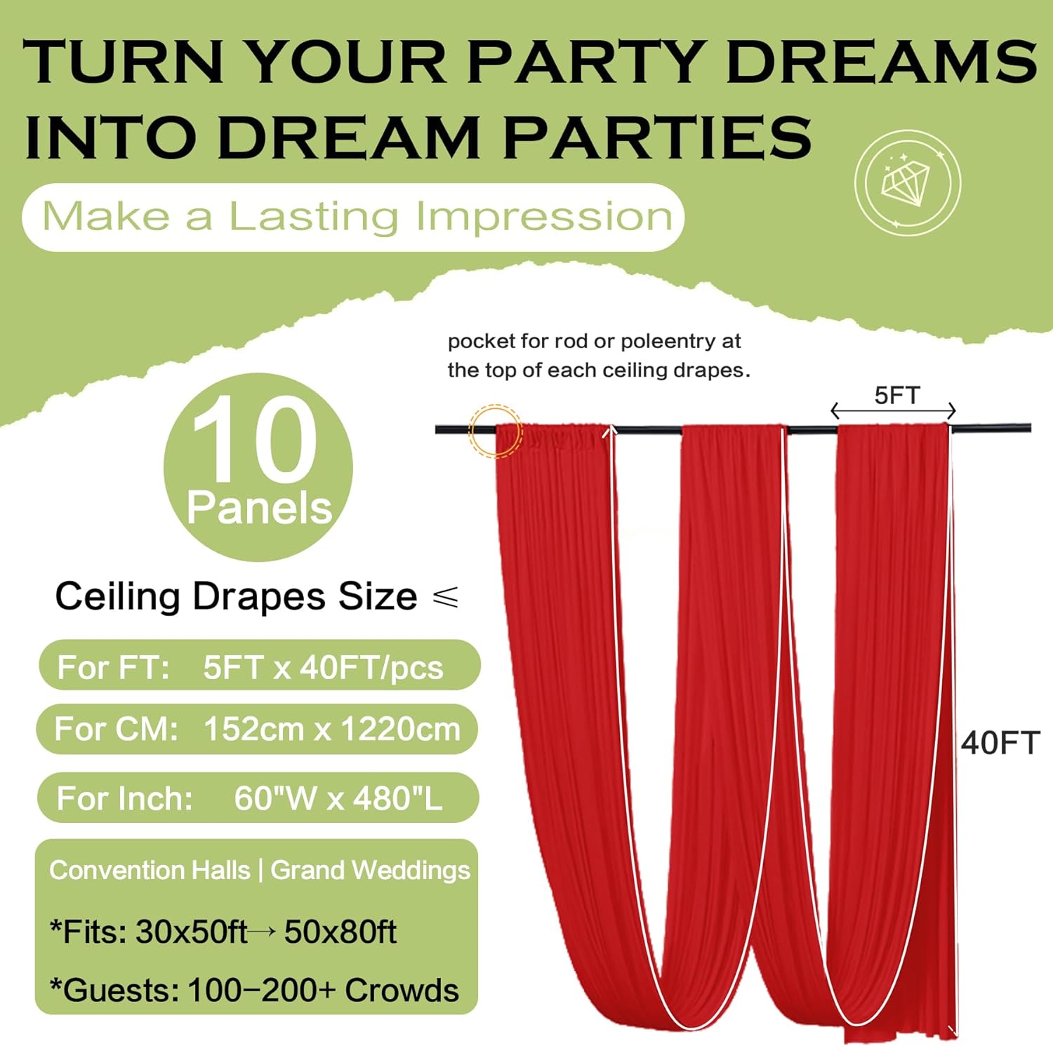 • Extra-Long Brilliance: This draping fabric, with its expansive 40ft Length, allows for grand and luxurious draping panels, making it an ideal choice for creating stunning backdrops, ceiling decor and tent draping that captivate attention.
