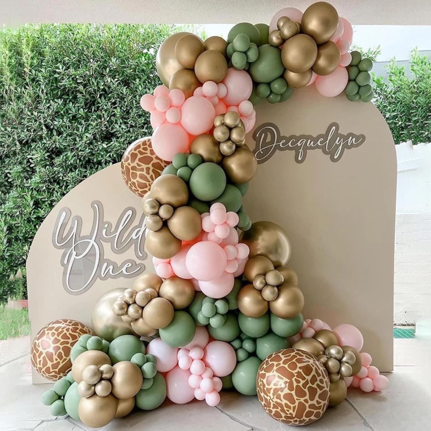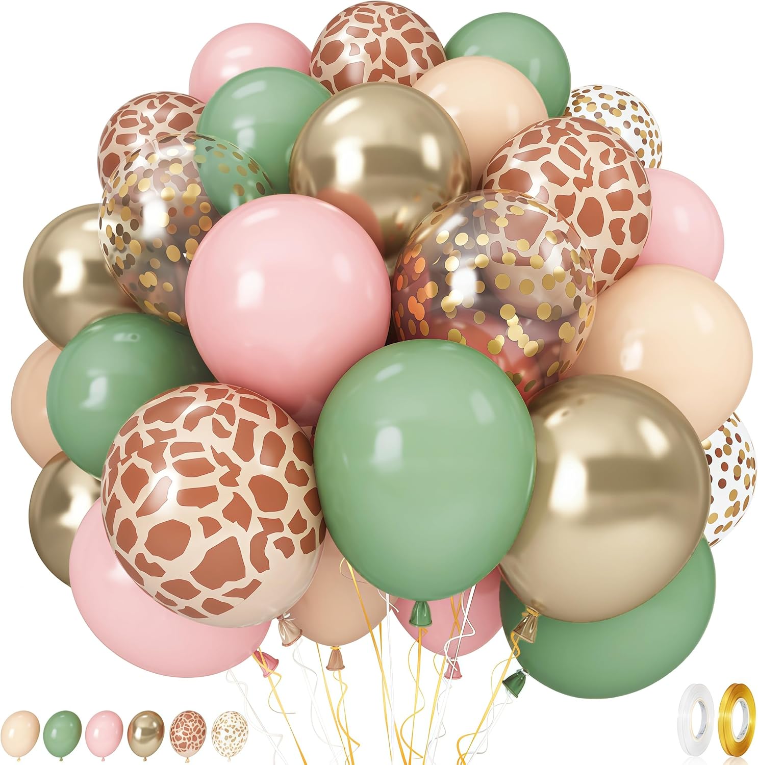 • Party Balloons Set: The pink safari balloons set have 60pcs 12 inch helium balloons, include 18pcs sage green balloons, 15pcs pastel pink balloons, 10pcs cream beige balloons, 6pcs metallic gold balloons, 6pcs giraffe print balloons, 5pcs gold confetti balloons, 2pcs white and gold balloon ribbon.