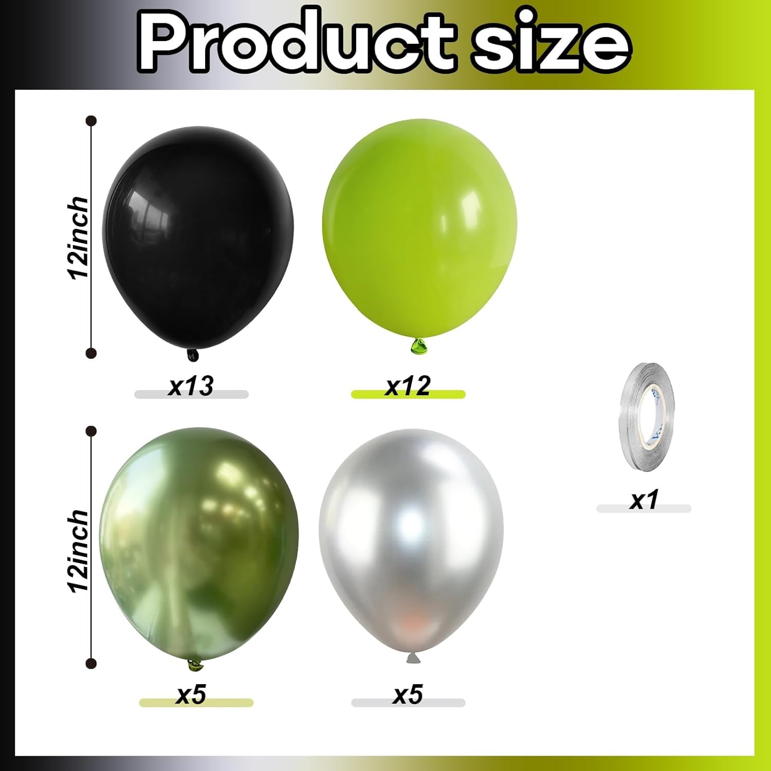 • Party Balloons Set: The video game balloons set have 35pcs 12 inch helium balloons, include 12pcs lime green balloons, 13pcs black balloons, 5pcs metallic light green balloons, 5pcs chrome metallic silver balloons, 1pc silver balloon ribbon.