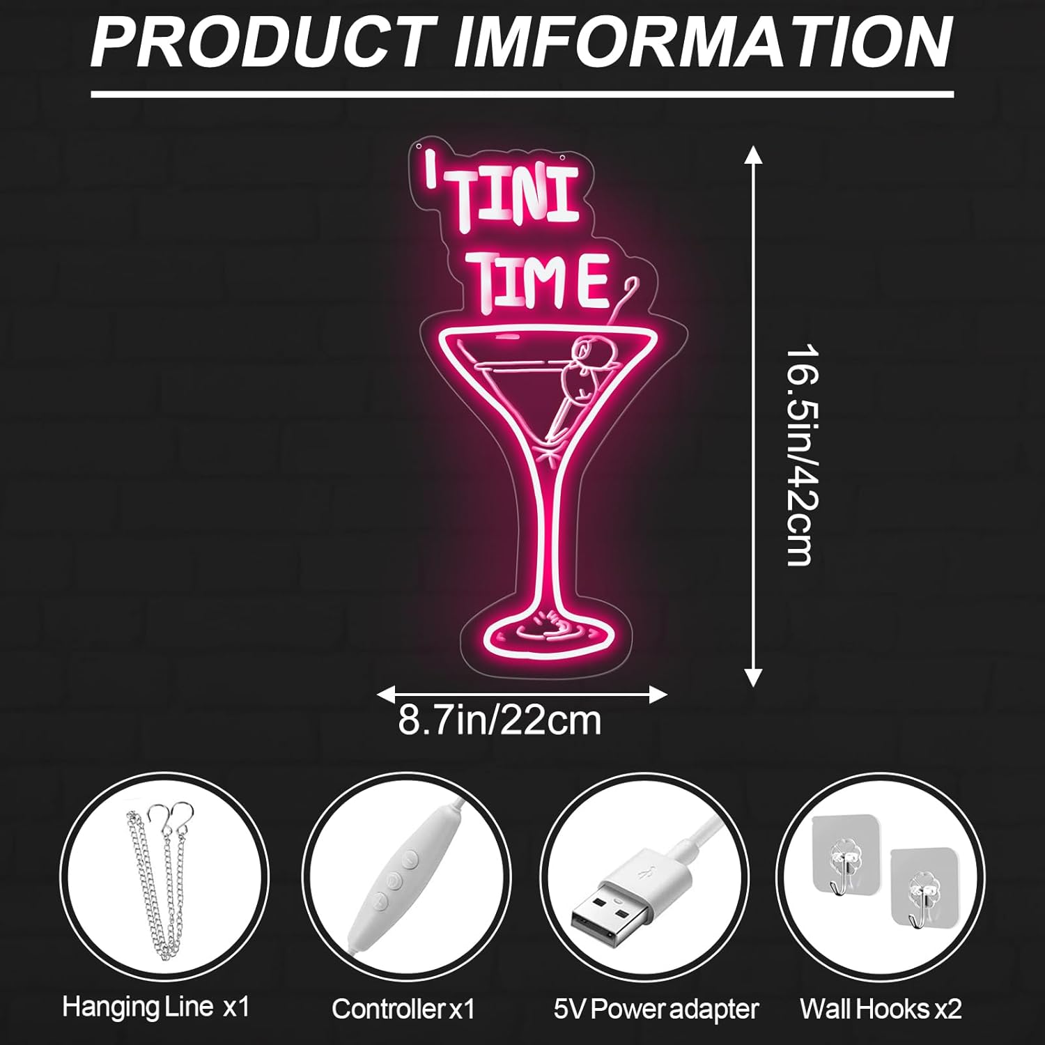 • What you get: Tini Time neon sign x1, hanging chain x1, wall hooks x2. Every LED light undergoes rigorous quality checks before it ships. If you have any problem with our neon light, please feel free to contact us. We will try our best to serve you