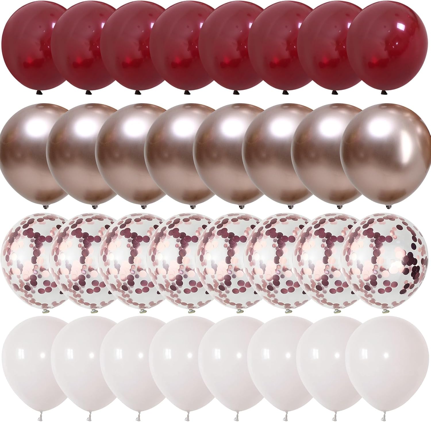 • Party Balloons Set: The burgandy balloons set have 35pcs 12 inch helium balloons, include 12pcs dark red balloons, 8pcs metallic rose gold balloons, 10pcs pearllllll white balloons, 5pcs chrome rose gold confetti balloons, 1pc rose gold balloon ribbon.
