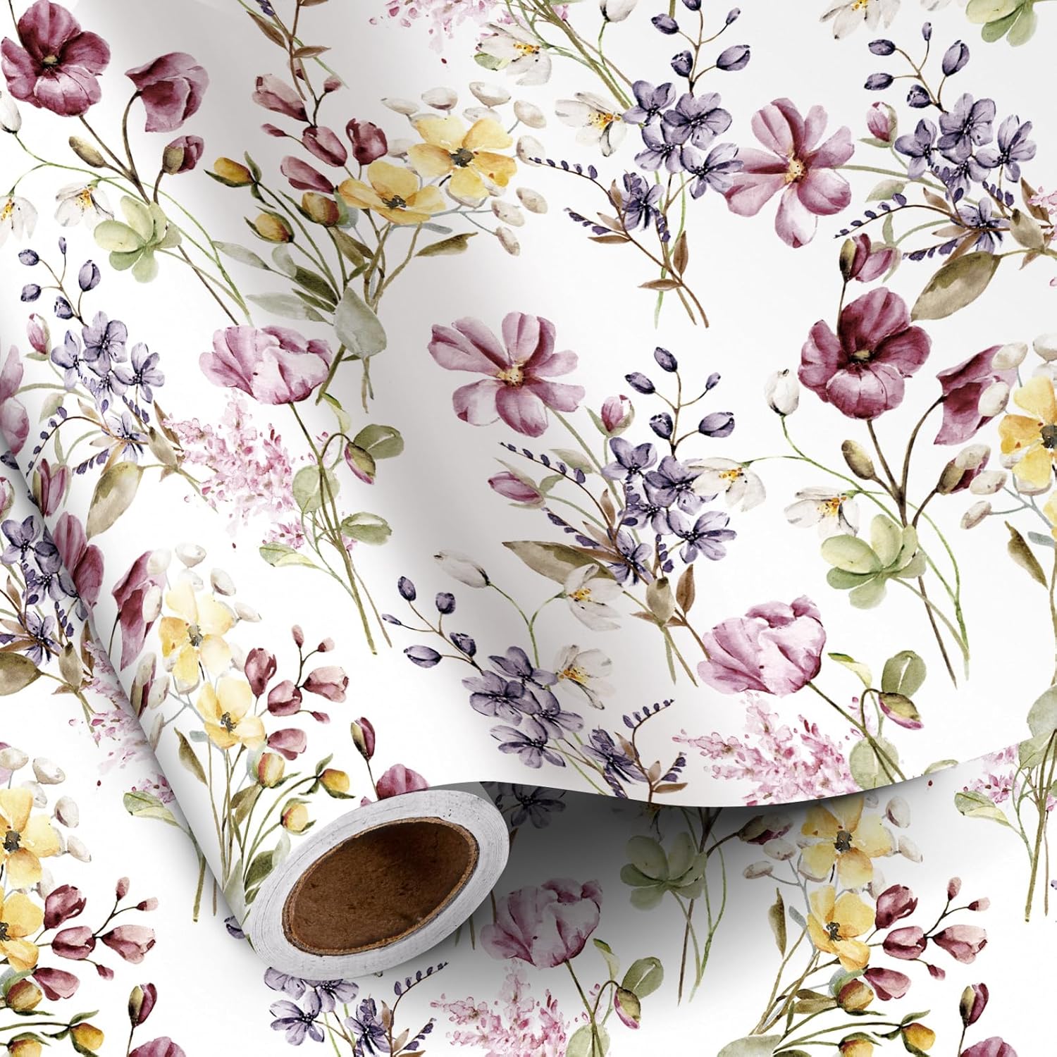 RUSPEPA Floral Wrapping Paper Roll Women Girls, Mini Roll, Watercolor Wild Flower with Delicate Leaf Gift Wrap Paper for Wedding, Birthday, Mother's Day, Spring, Bridal Shower, 17 Inch X 16.4 Feet