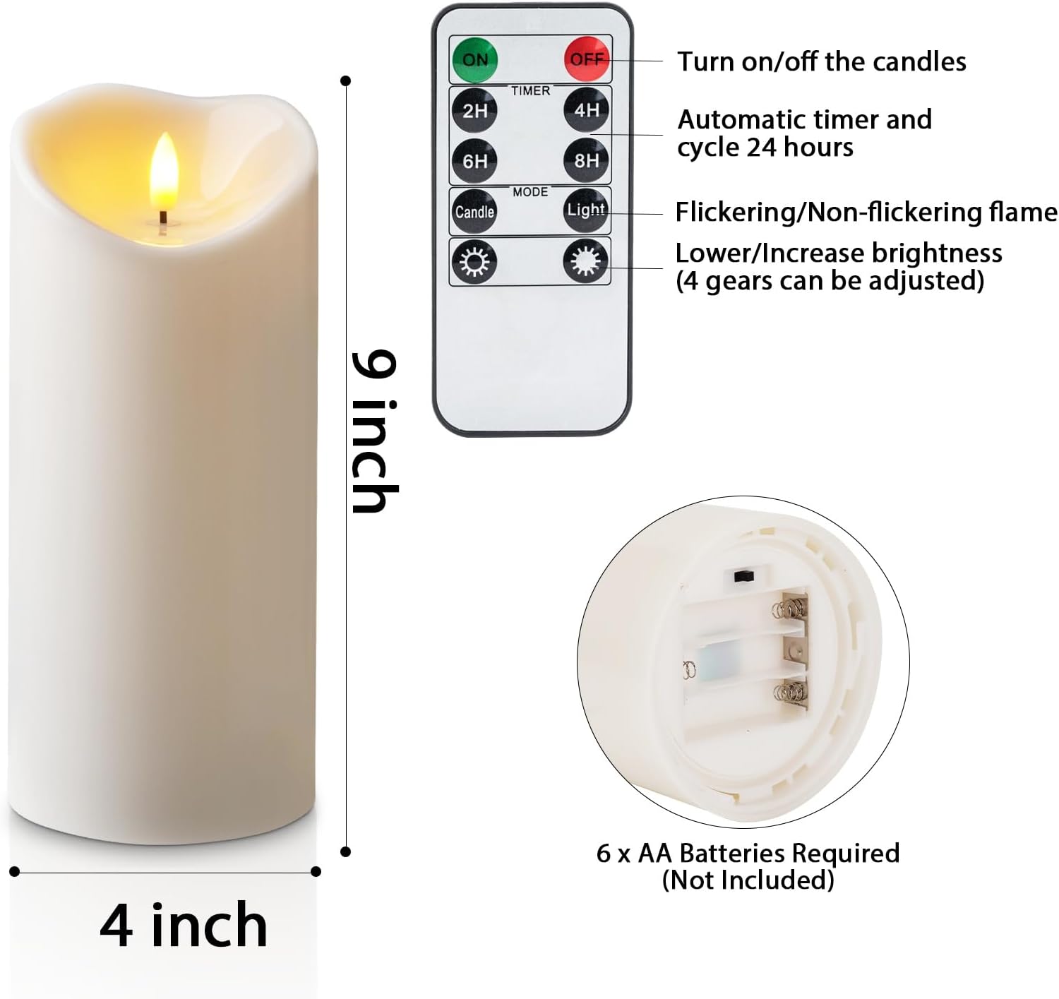 • Package List: You will receive 2 set large candles (4” in diameter and 9” in height), each candle requires 3 AA batteries (batteries Not included), 1 remote control, and 1 manual.