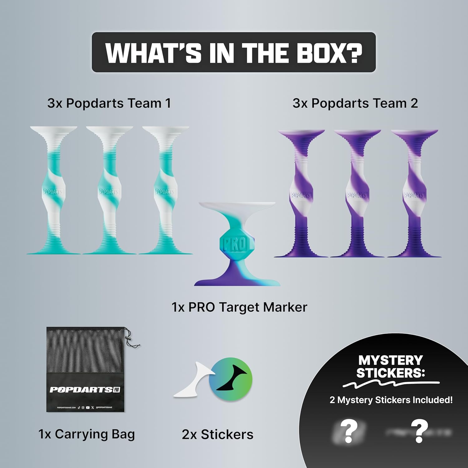 • WHAT’S INCLUDED IN A SET? 3 White/Teal Popdarts | 3 Purple/White Popdarts | 1 Purple/Teal/White Target Marker | 2 Mesh Carrying Bag with rules printed right on the bag