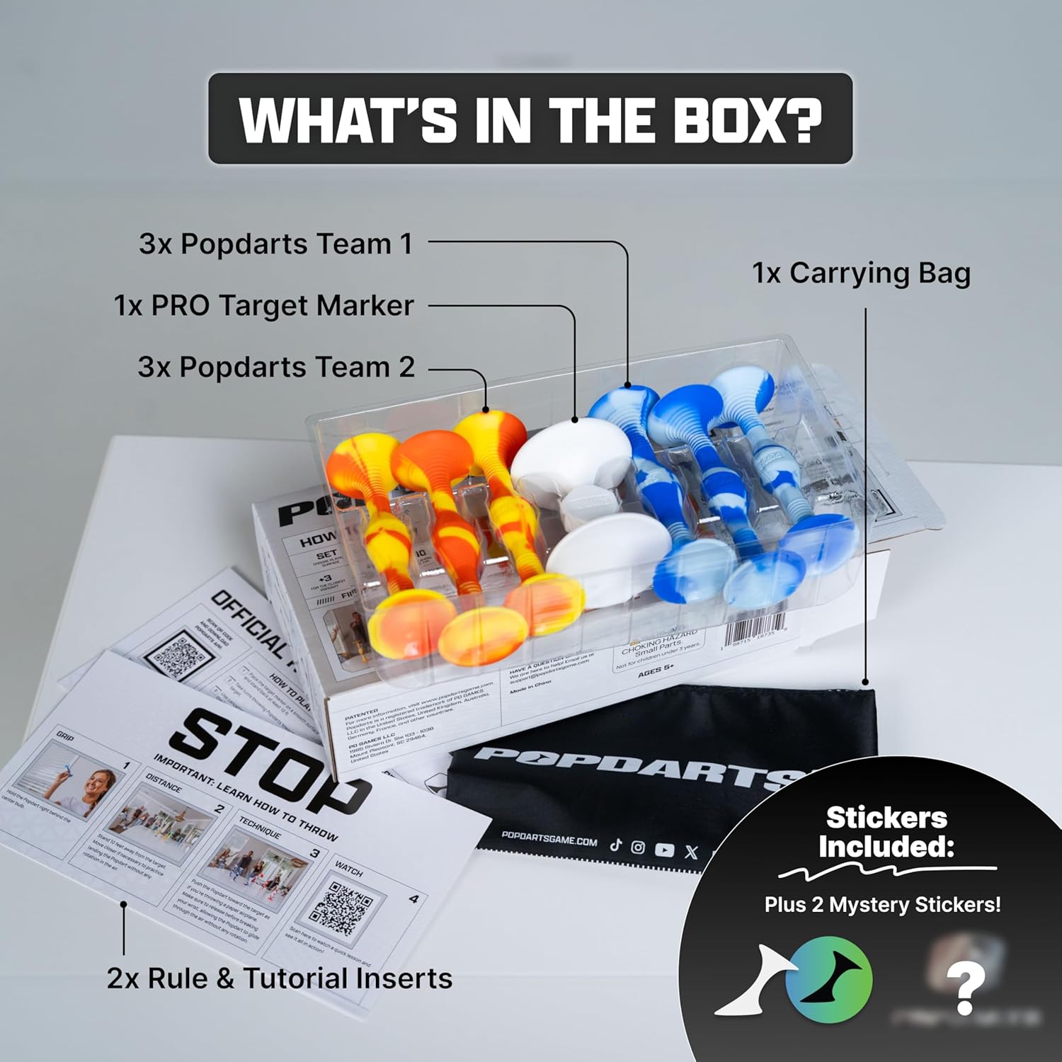 • WHAT’S INCLUDED IN A SET? 3 Orange/Yellow Swirled Popdarts | 3 Blue/White Swirled Popdarts | 1 White Target Marker | 4 Mesh Carrying Bag with rules printed right on the bag