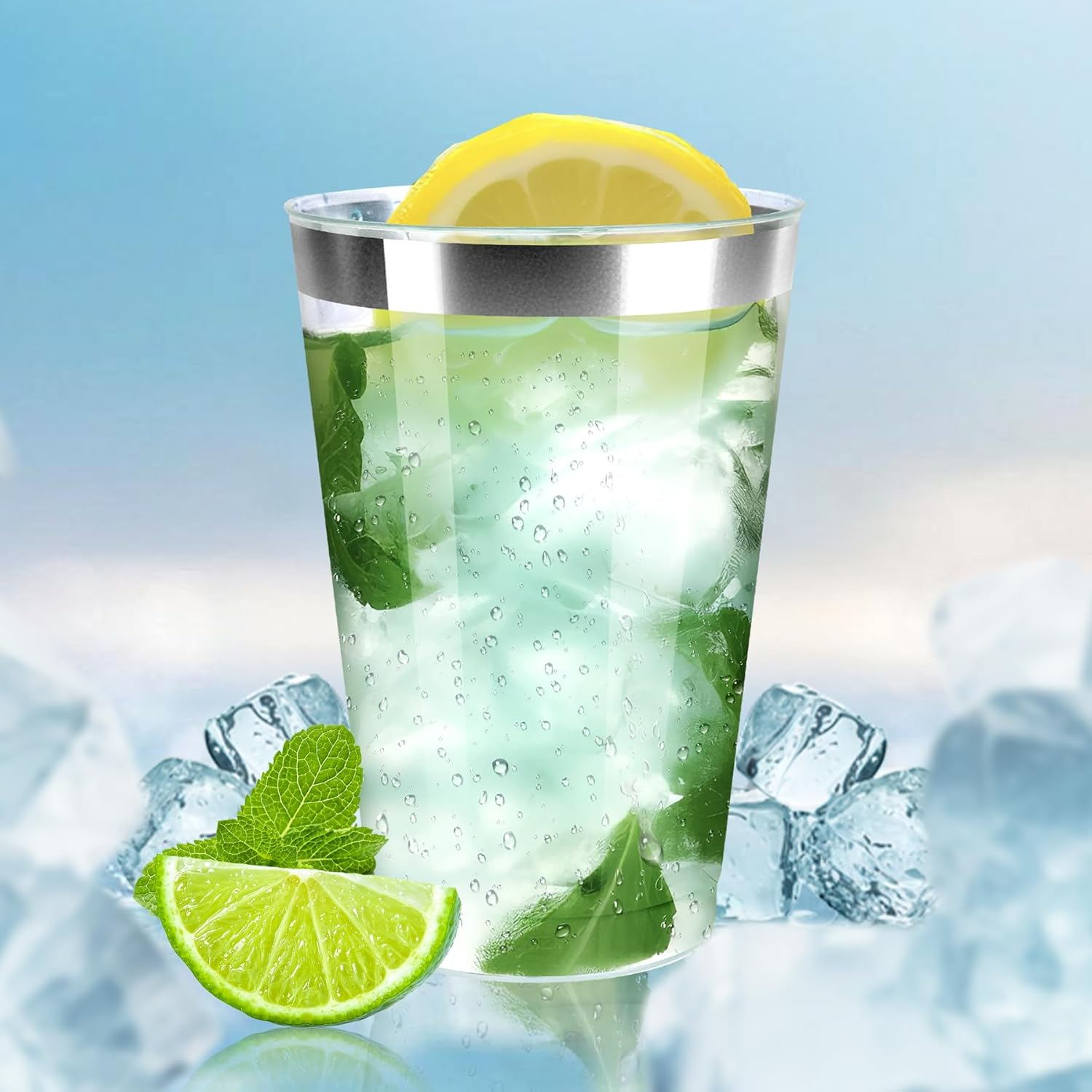[200 Pack 12oz Clear Plastic Cups with Silver Rimmed Sturdy & Food Safe Disposable Wine Glasses Party Cups Wedding Cups Disposable Drinking Cups for Wine, Juice, Cocktails and Cold Beverages