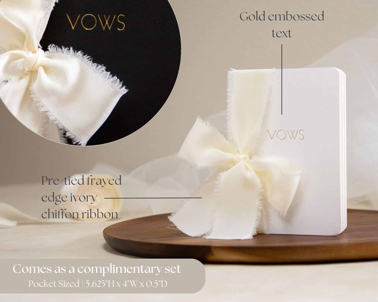 • Each vow book in our set measures 5.625 x 4 x .5 inches, making them pocket-sized for easy carrying. Crafted from high-quality materials, these softcover vow books offer durability with a sophisticated finish. The flowy ivory ribbon adds a touch of romance and softness against the texture of the book.