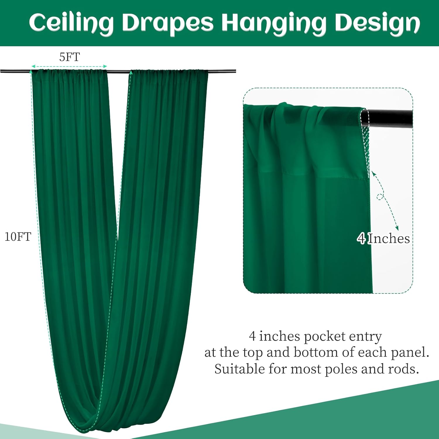 • Chiffon Ceiling Drapes: The package include 6 panels emerald green wedding ceiling drapes (without hanging pieces). Each wedding extra long curtain measure for 5 feet width x 10 feet length. The sufficient quantity can meet your demands for decorating your weddings, parties, receptions. It will help to create a delicate and aesthetic sense to your wedding ceiling decoration.
