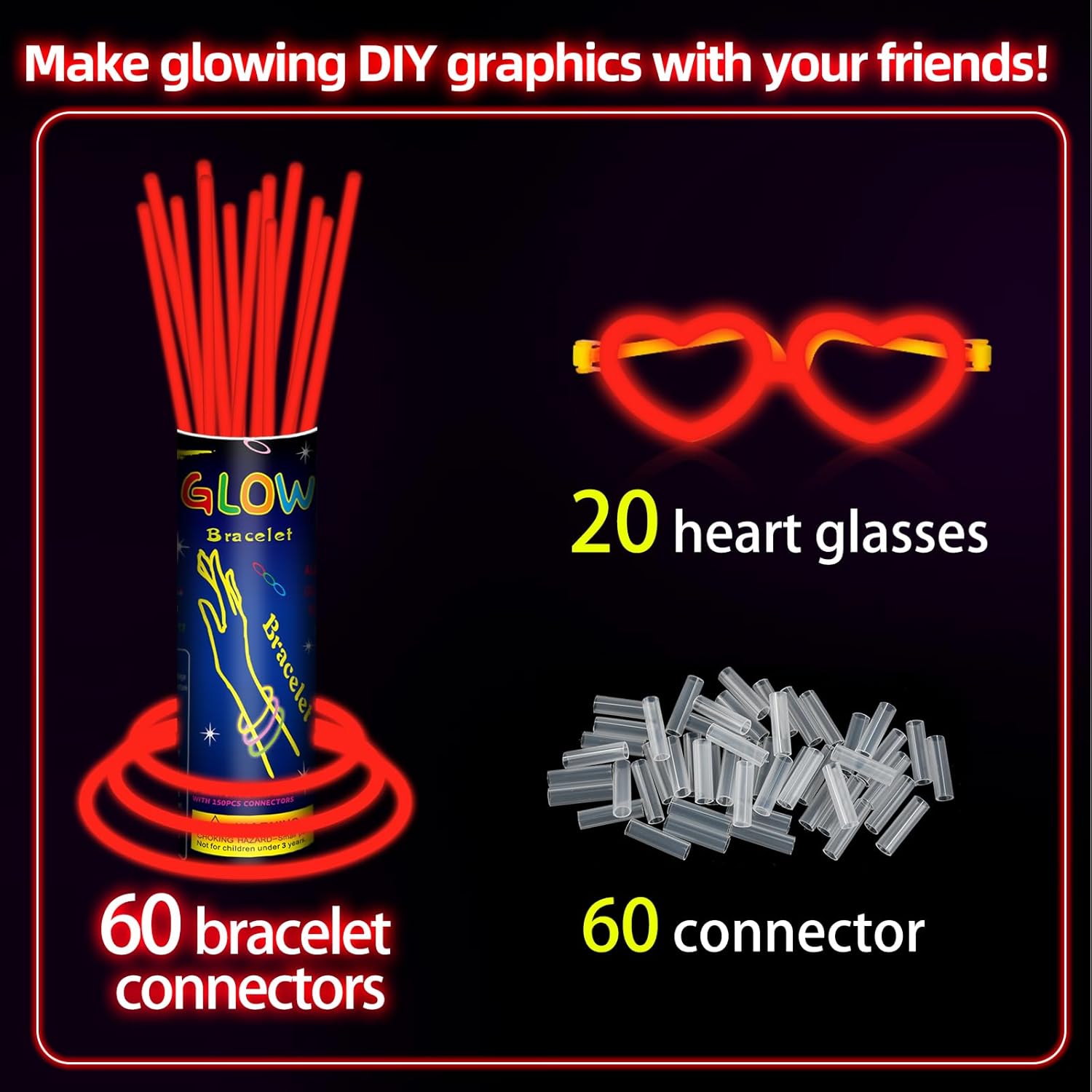 • 20 Set Glow In The Dark Party Supplies: You will receive 60 glow sticks, 60 connectors and 20 heart glasses, and you can easily make 20 glow stick bracelets and 20 glow heart glasses. Have a fun evening with your friends! (Note: if only 20 glasses are made, there will be an excess of 40 connectors)