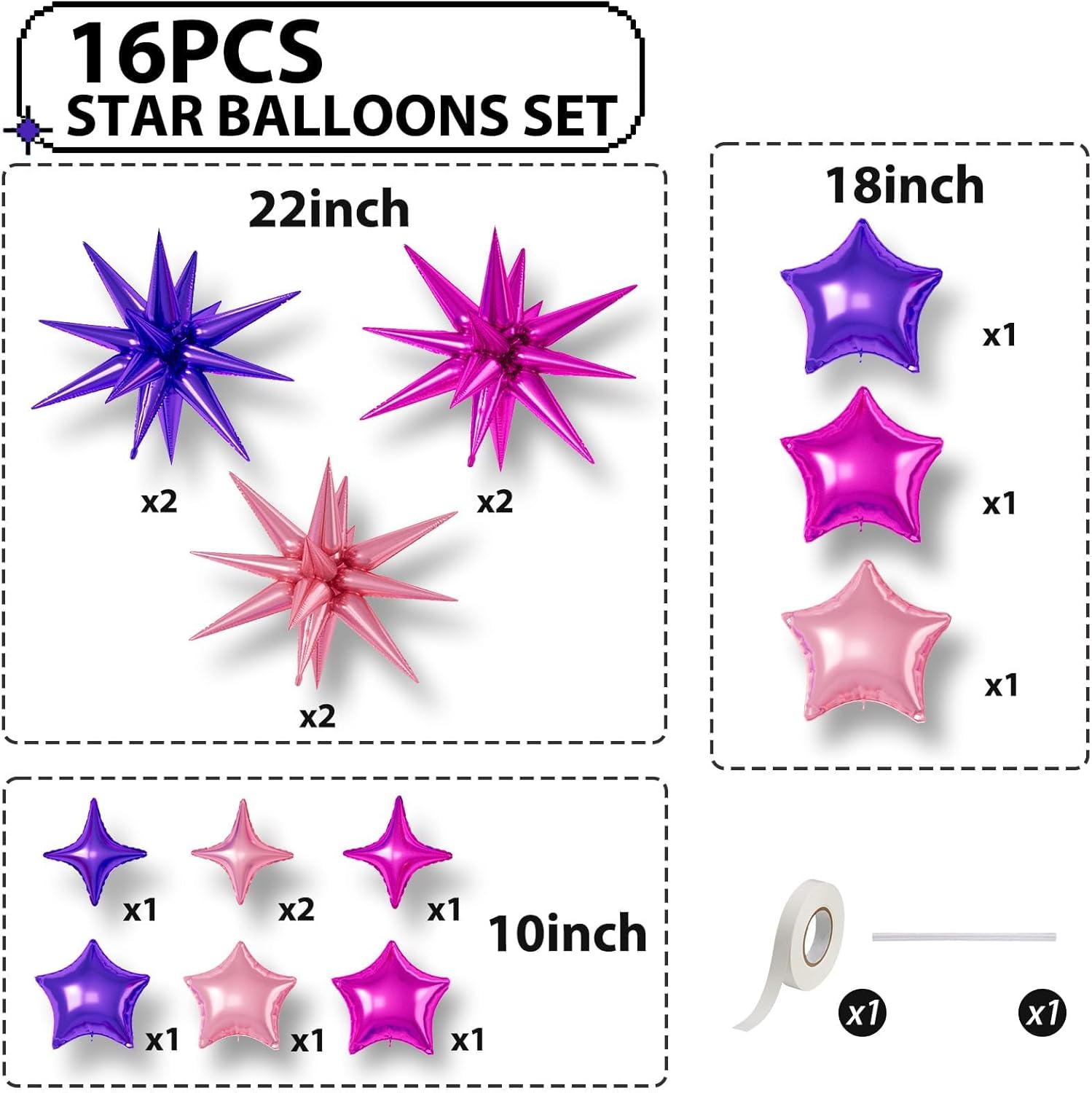 • 【Hot Pink Purple Star Balloons】The package includes:6pcs 22-inch Star-Shape balloons(Pink*2,Purple*2,Hot Pink*2), 4pcs 10-inch Four-Pointed Star balloons(Pink*2,Purple*1,Hot Pink*1), 3pcs 18-inch Five-Pointed Star balloons(Pink*1,Purple*1,Hot Pink*1), 3pcs 10-inch Five-Pointed Star Shape balloons(Pink*1,Purple*1,Hot Pink*1),1 dispense and 1 straw. These foil star balloons are Great for birthdays, weddings, baby showers, and engagement parties