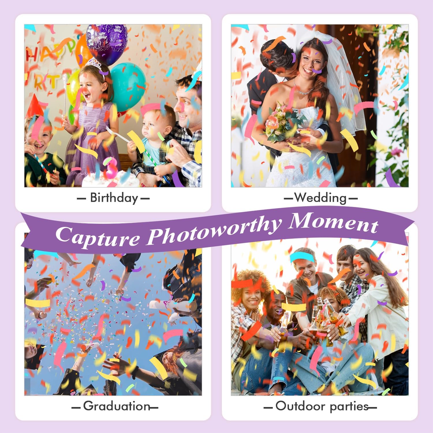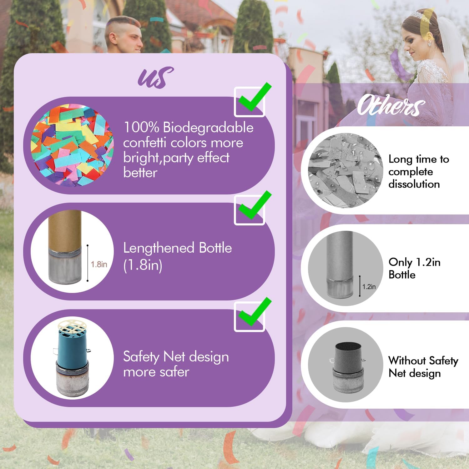 • Security and upgrade materials; Equipped with an internal safety net, these Confetti Cannon prevent any firmware from popping out, ensuring a safe and worry-free experience for both adults and kids. Using craft rice paper, the color is more vivid and bright. Thin and light than other paper shavings in the air floating longer effect more