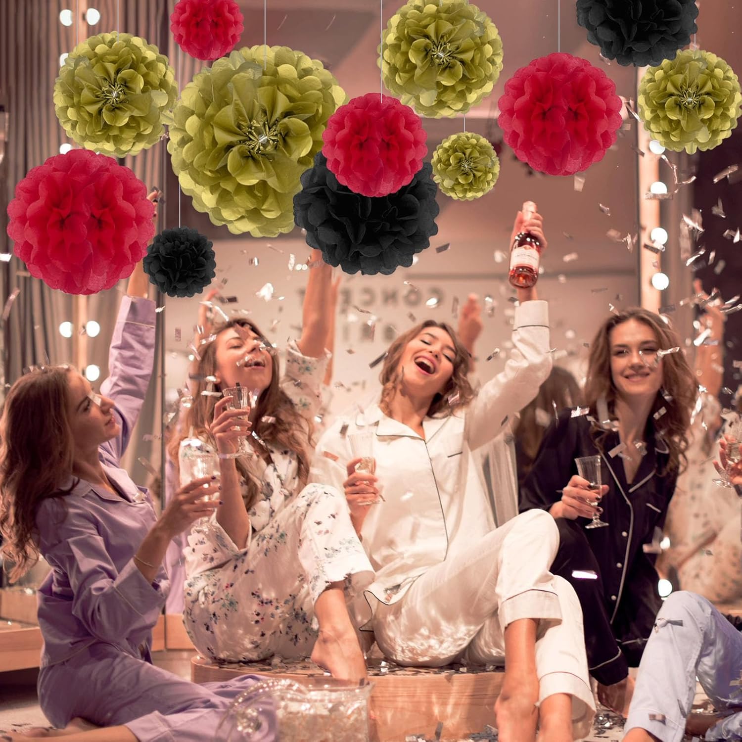 • 【Large Set】18 Pieces paper flower balls include 6 of 6-inch, 6 of 10-inch, 3 of 12-inch, and 3 of extra-large 14 inch paper pom pom flowers.This tissue flower set comes in 3 different colors including Red,Black,Gold, which will add charm to your celebration through different color combinations.