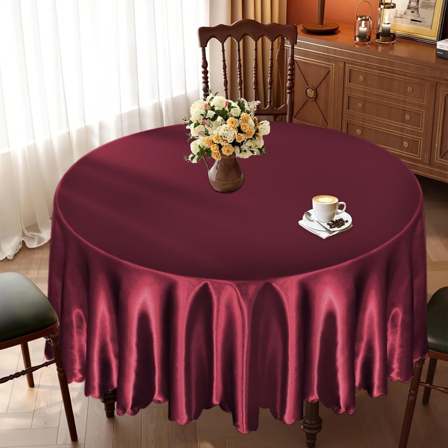KKJIAF 1 Pack Round Table Cloths 90 Inch, Burgundy Overlay Round Satin Table Cover, Silky Satin Dining Tablecloths for Wedding Buffet Parties Banquet Decoration