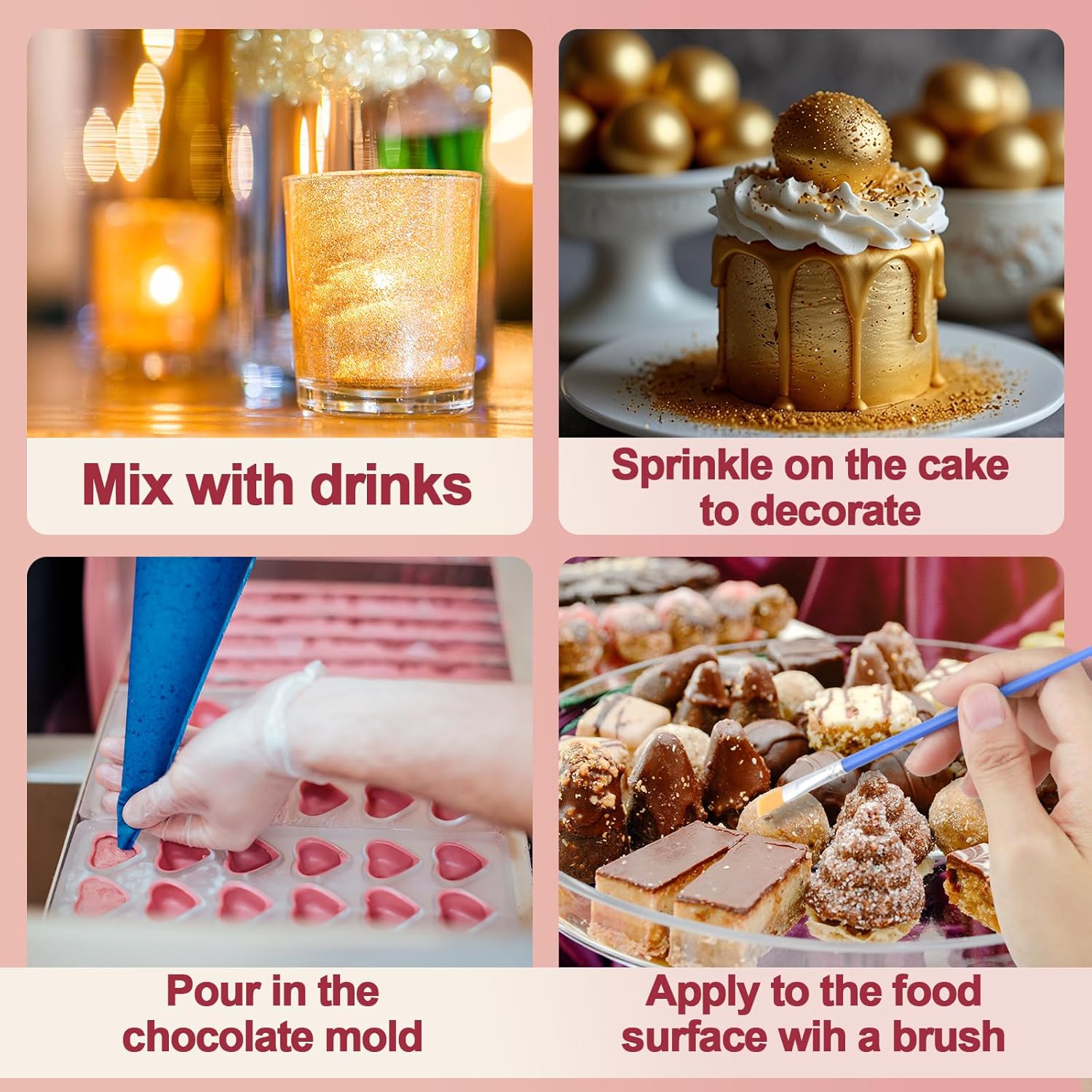 • ✔Easy to Use - The perforated bottle cap design allows precise control of the amount used. Simply tap the bottle to sprinkle the edible glitter onto food or drinks, or use a brush to apply it directly to molds or food. Ready to add a magical touch whenever inspiration strikes.