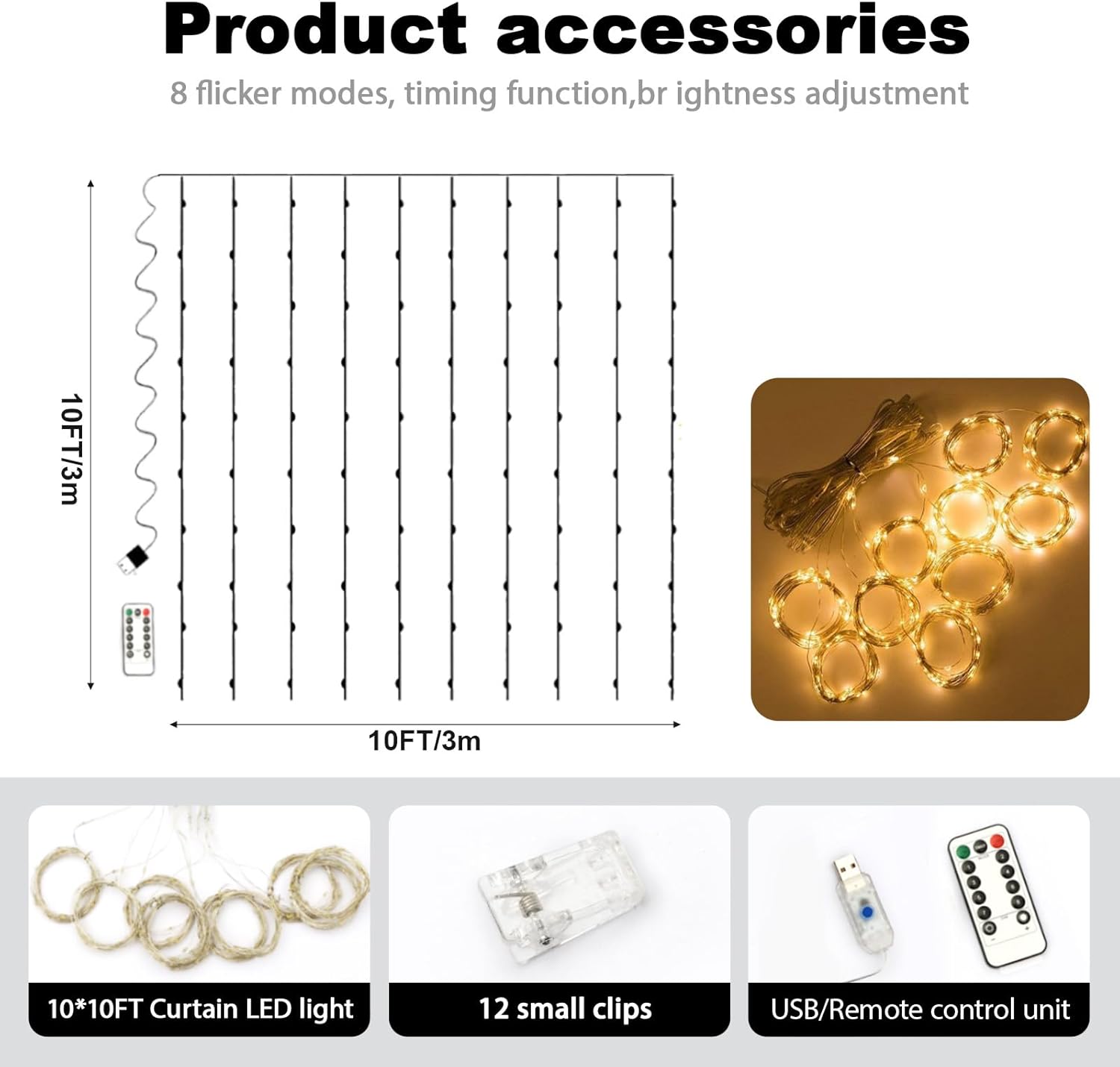 • Installation of the String Lights: The string lights come with 12 transparent clips. During installation, use the clips to attach the light wires to the curtain. The string lights can be powered by USB interface. These string lights are sturdy and durable, so you can install them with confidence.