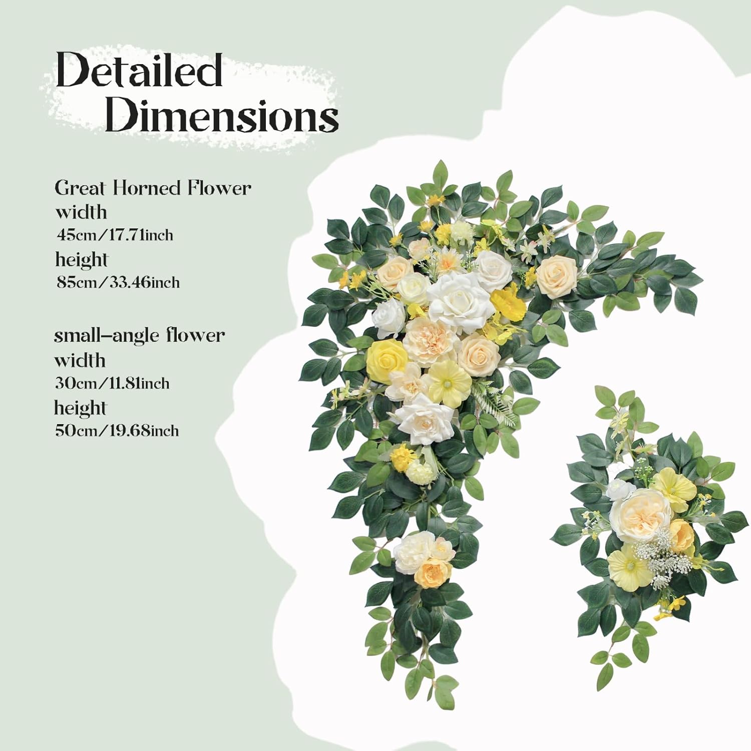 • 🌷 Size and Package:Our wedding arch flowers has a large corner size of 33.46 "L x 17.7" W and a small corner size of 19.68 "L x 11.8" W. The wedding decor packaging contains a total of 3 kinds of accessories,including Wedding Flowers Ornament x2 + Cable Tie x 6 +20pcs plastic stems (Does not include wooden sign and bracket).