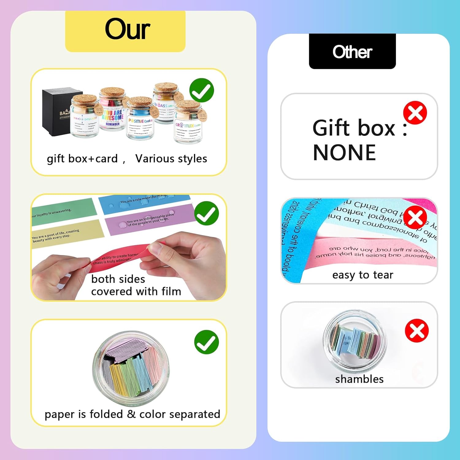• Decorative Touch of Positivity: Infuse Every Corner with Good Vibes:Add an inspiring accent to any space! This affirmation jar brings a cheerful, motivational vibe to dorms, shared apartments, or offices. Its vibrant contents offer instant emotional support during late-night study sessions at a student desk, or kickstart positivity at your morning kitchen island, creating a visually and emotionally uplifting experience that enhances mental health. A top choice for inspirational gifts.