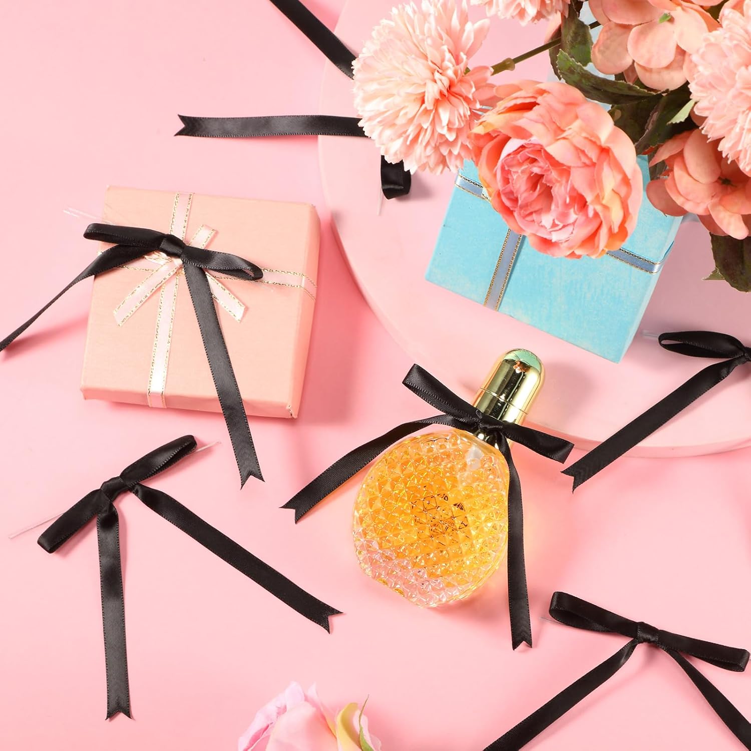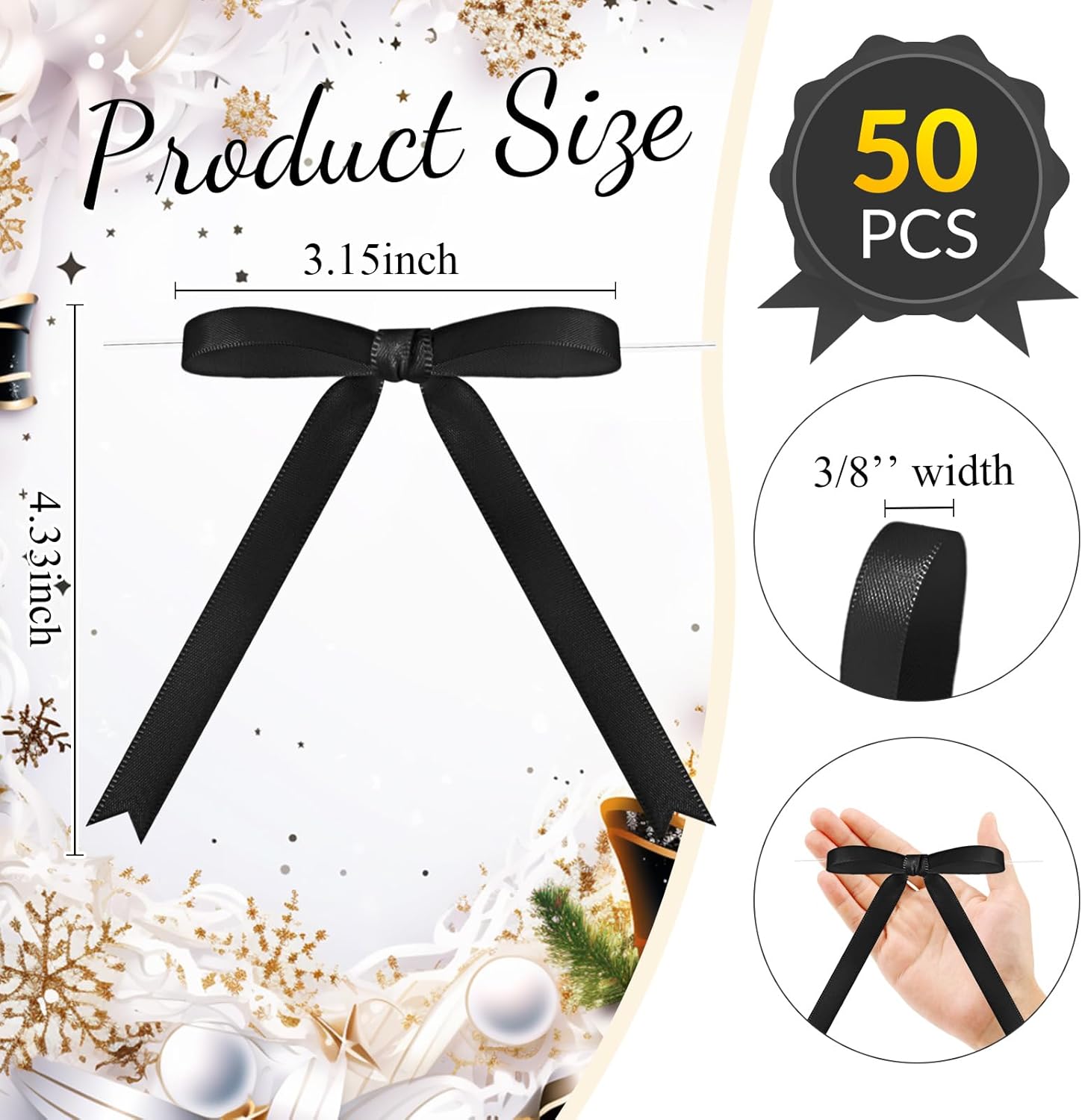 Riceshoot 50 Pcs Twist Tie Bows for Cake 3x4.5 Inch Satin Ribbon Bows for Gift Wrapping Treat Bags Craft DIY Wedding Baby Shower Birthday Party(Black)