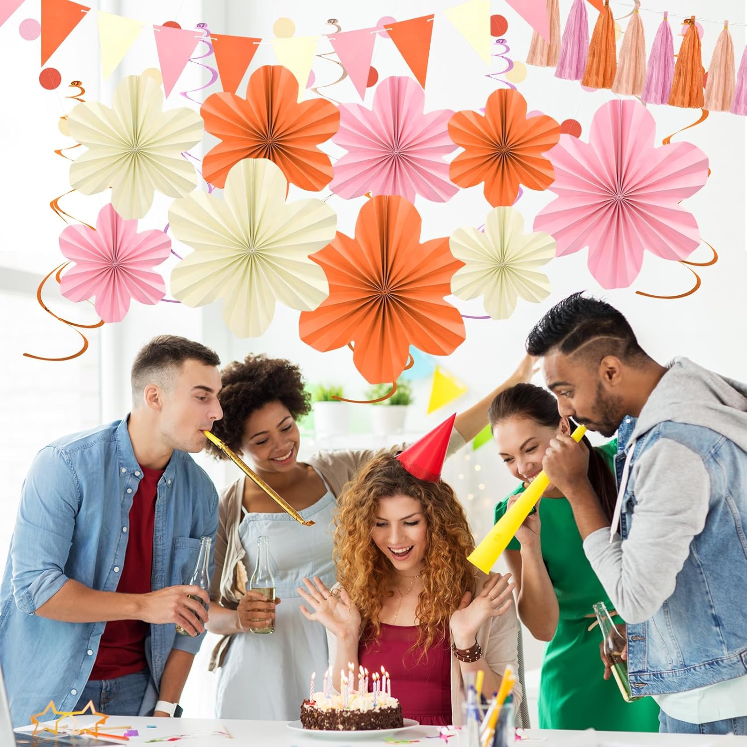 Pink and Orange Party Decorations - Orange Birthday Decoration for Women Girls with Hanging Paper Flowers, Tassel Garland and Swirls, Baby Showers Bachelorette Party Supplies Classroom Decor