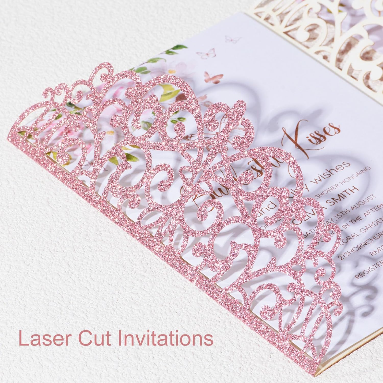 25pcs Glitter Laser Cut Wedding Invitation Kits Pink Personalized Invitation Pockets 5×7 Invitations with Envelopes and RSVP Cards Blank for Wedding Quinceanera Bridal Shower Engagement Birthday Party