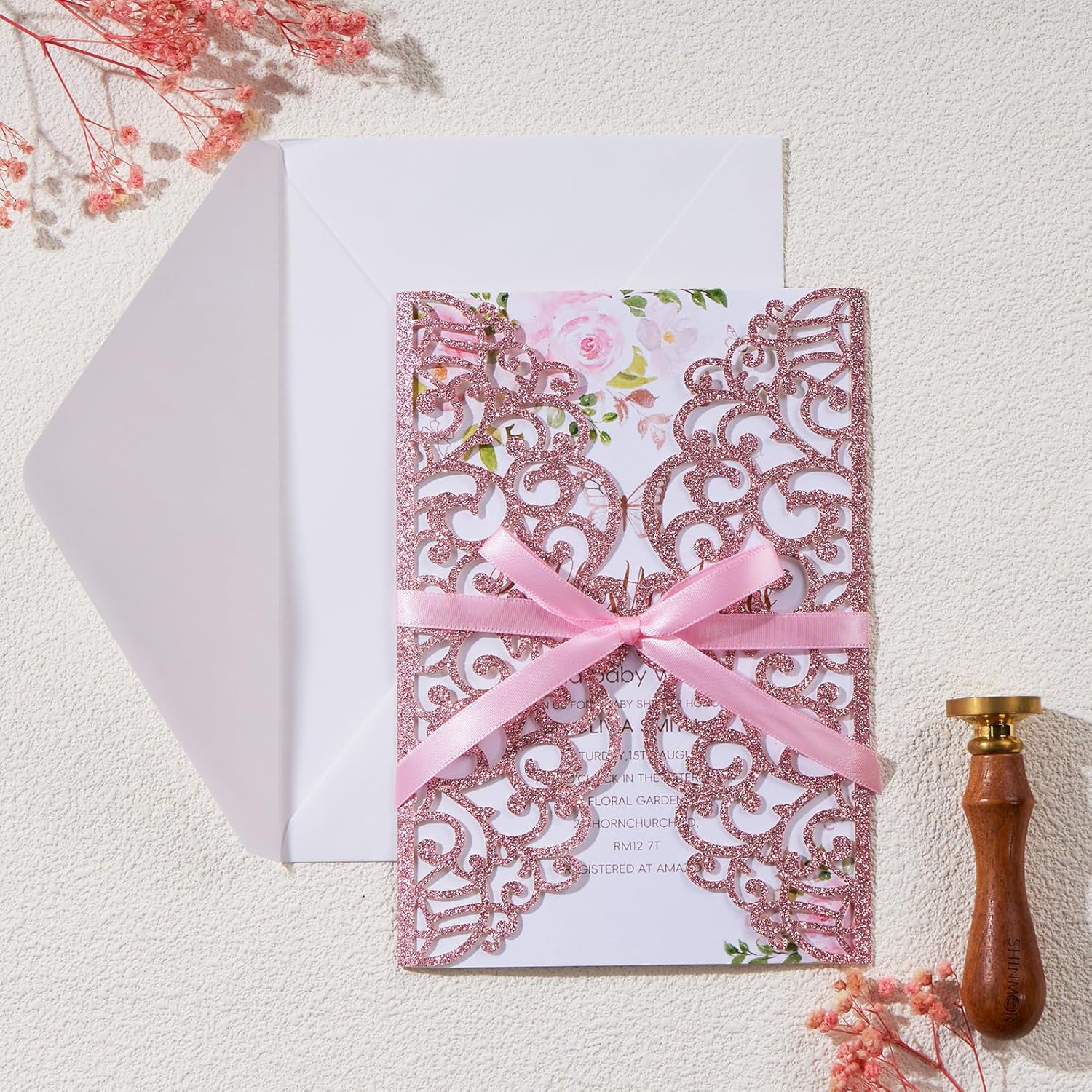 • Luxury Party Invitations: This pink invitation features hollow out floral design, high quality laser cut technology and non-flaking glitter with pink bow ribbon makes the whole invitation exquisite and elegant. Perfect for any important and special occasion!