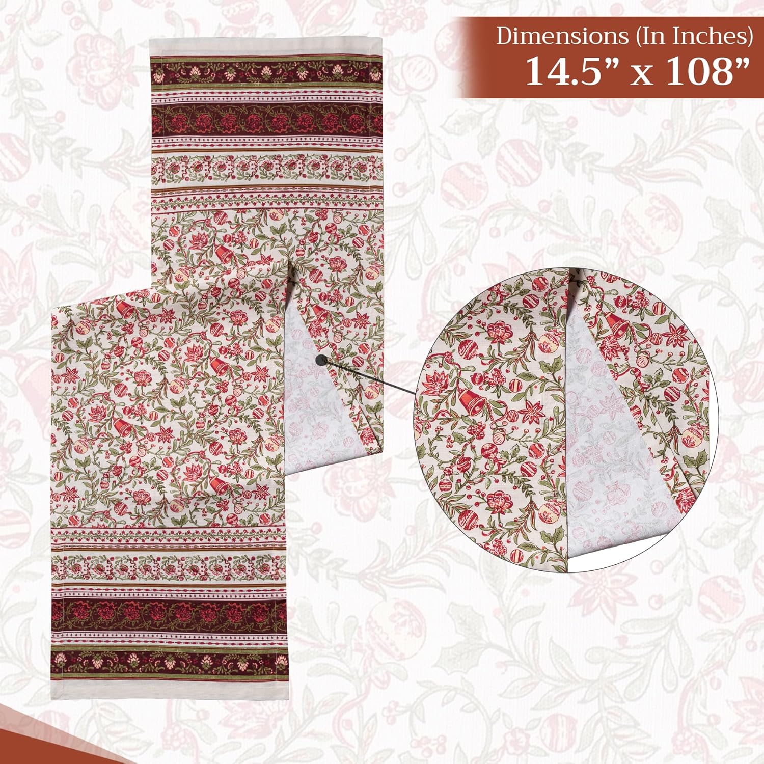 • Package Includes: 1 table runner measuring 14.5" x 108", made from 100% cotton. Ideal for banquet tables, dining tables, or adding a spring, Thanksgiving, or Christmas touch to your party decor. This 108-inch table runner brings unique charm to both casual and festive settings