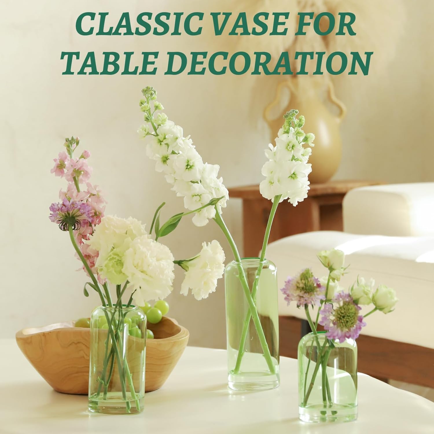 • Quality & Safety: Green glass bud vases is made of selected premium thick borosilicate glass,hand-blown to a bright and high transparent finish with durable and sturdy. The top of the vase is smooth with no sharp edges, ensuring safety during the flower arrangement process. Note: Remember to add an appropriate amount of water according to the quantity and weight of the flowers for stability.