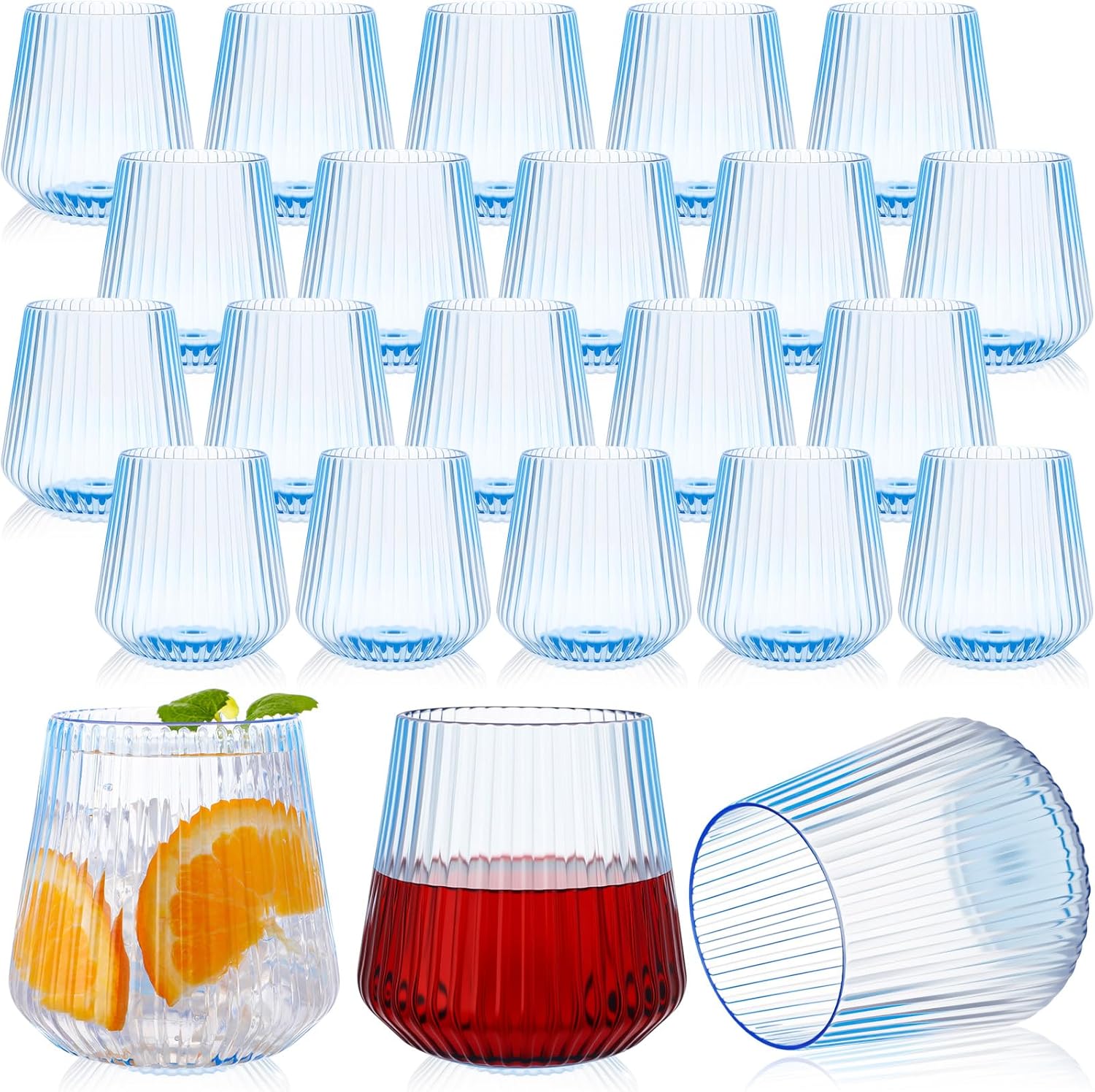Suclain 50 Pcs Plastic Wine Glasses Ribbed Stemless Wine Glasses 14oz Vertical Design Unbreakable Cups for Outdoor Indoor Vintage Elegant Champagne Whiskey Glasses for Christmas Party Wedding (Blue)