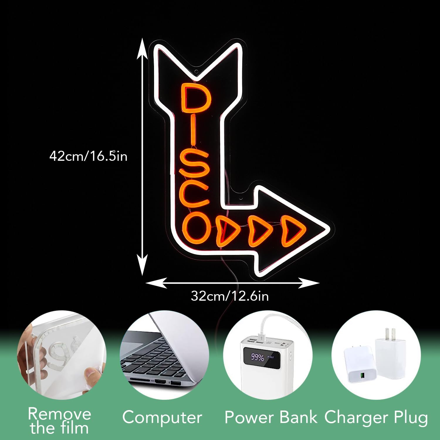 • Material and Size: The disco neon light signs measures approximately 16.5 * 12.6 inches and is designed with 5V low voltage. It consists of flexible LED light strips, white adhesive strips, and a sturdy transparent acrylic back panel. Compared with traditional glass neon lights, it has a longer service life and no risk of glass breakage. It is not easy to heat up and can be touched with confidence