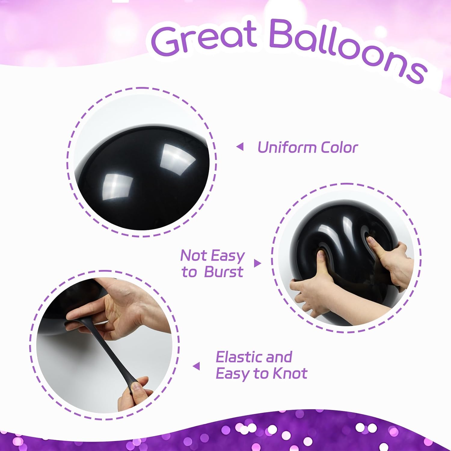 • Great Balloons: The black and purple balloons are made of great latex, it offers great elasticity, thick and sturdy