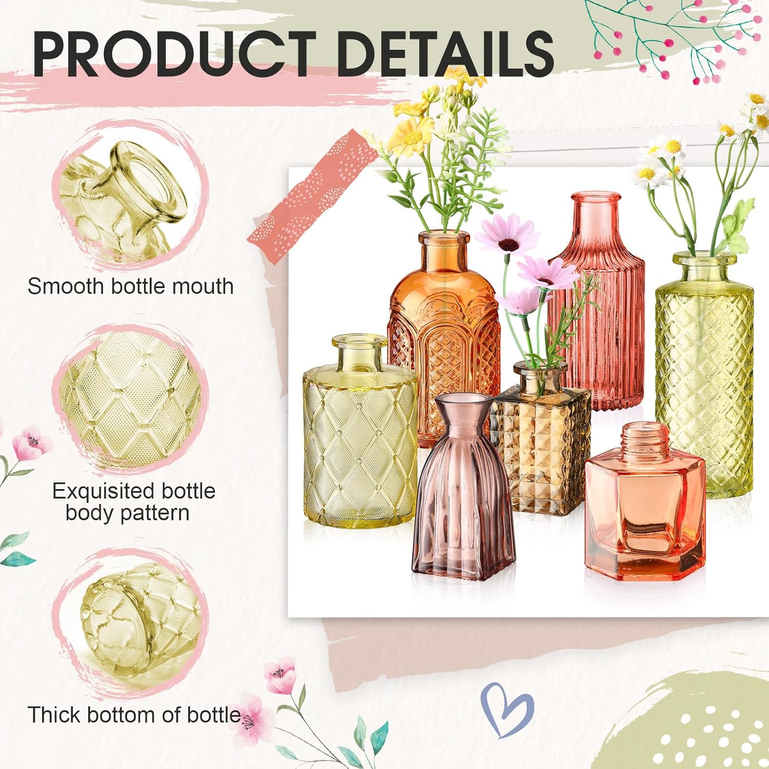 • Versatile Sizes: featuring a versatile range in sizes from 3 to 6 inches in height, our colorful vases cater to diverse needs and preferences, whether you need a small vase for a modest arrangement or a larger one to make a statement, we've got you covered, and their varied sizes also facilitate creativity in arranging them in different spaces