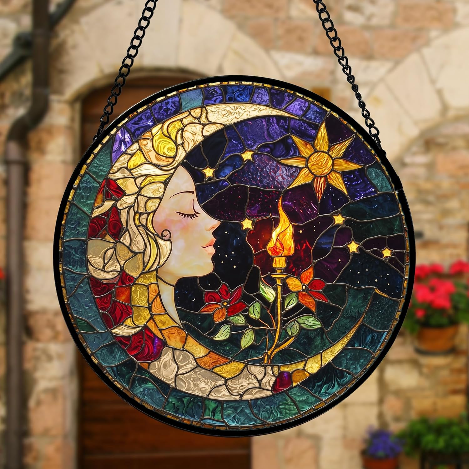 Stained Glass Window Hanging, Moon Goddess Torch Suncatcher Diamond Glass Panel Hangings Dream Sun Catchers Decor for Birthday for Women, Men, Wife, Aunt, and Mom 7.8 in