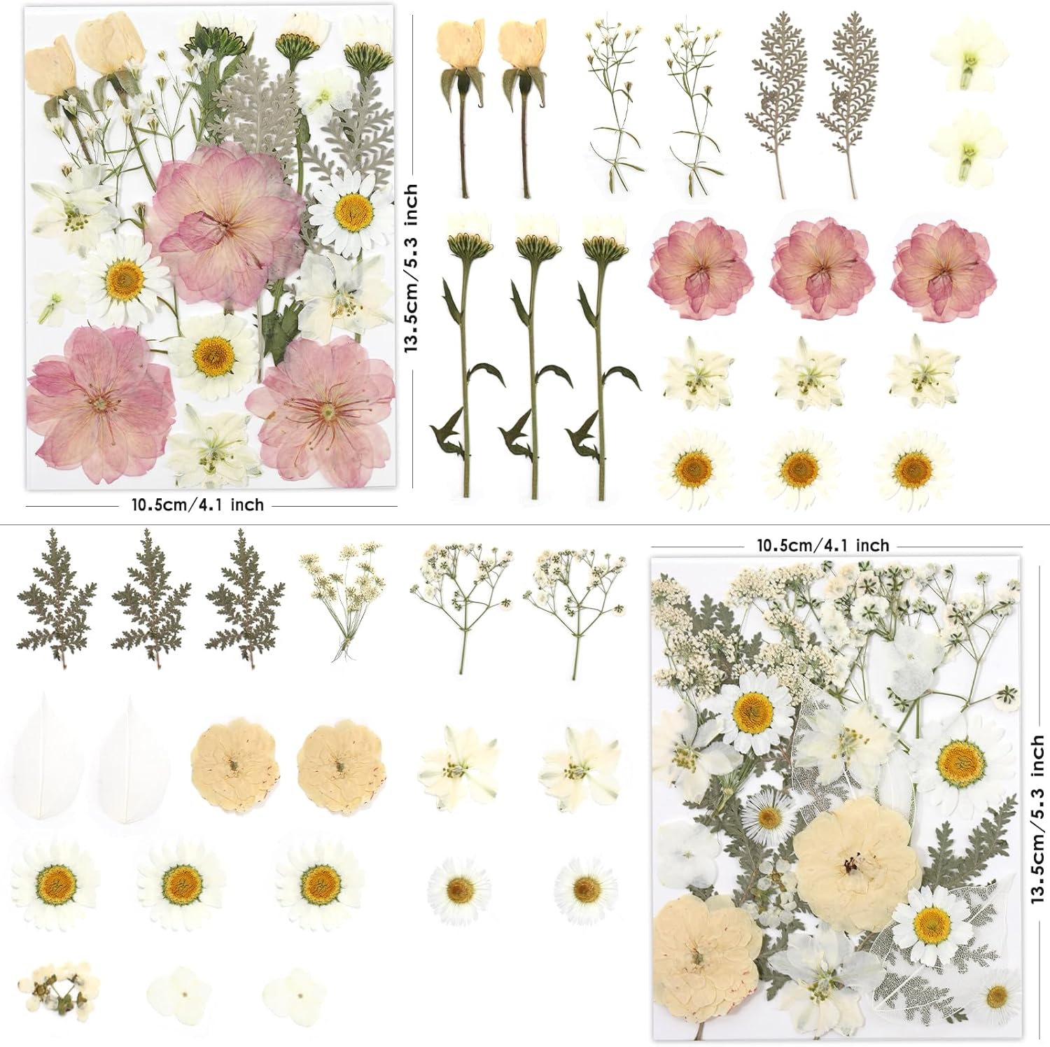 • Vibrant Natural Dried Flowers: A set of 80 dried pressed flowers for crafts flaunts soft yellow, white & pink hues. Carefully selected, naturally preserved, they keep their allure. Ideal for resin art, jewelry - making, scrapbooking & DIY