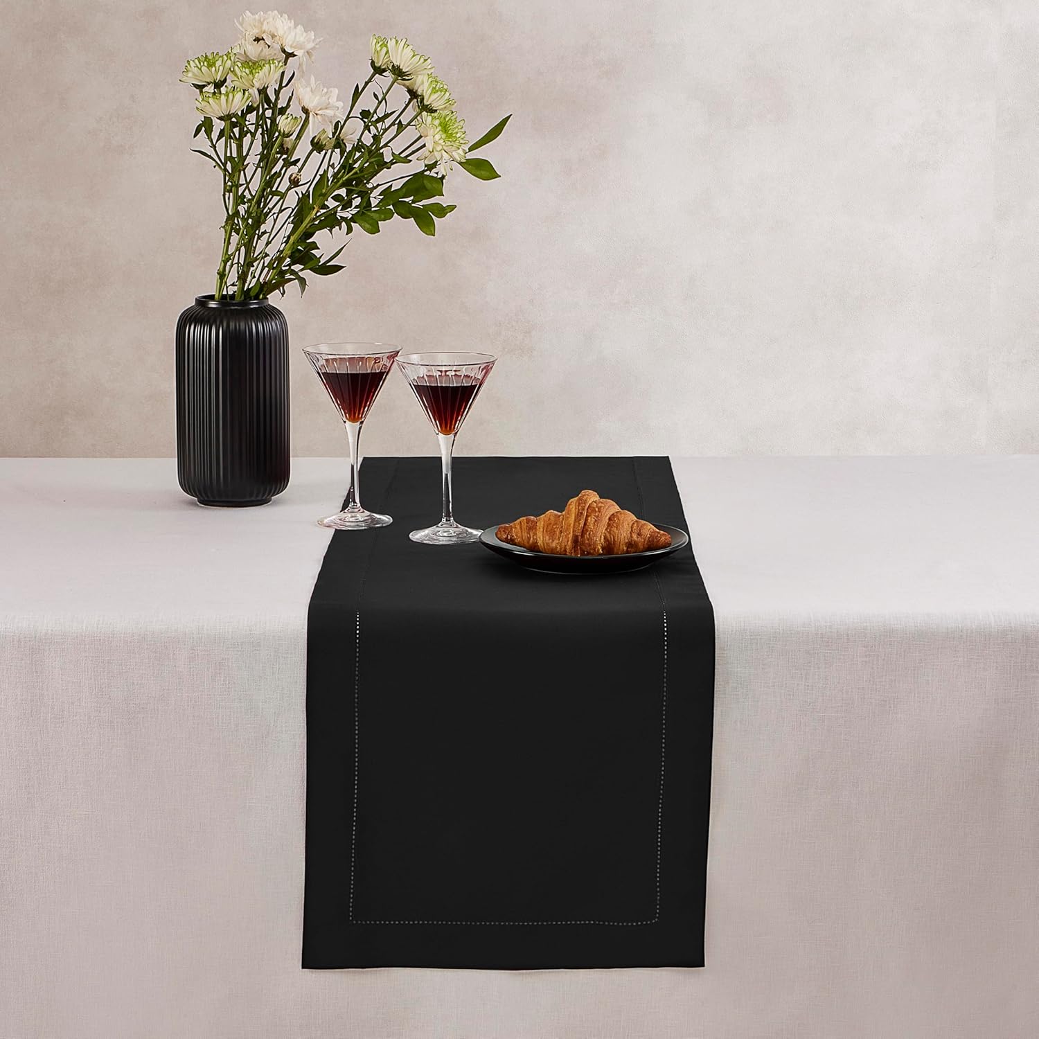 Black Table Runner 90 Inch–Cotton Linen Hemstitch Farmhouse Table Runner 14x90 – Washable Fabric for Dining, Fall, Halloween, Thanksgiving, Spring, Summer, Wedding, Everyday Décor – Serena