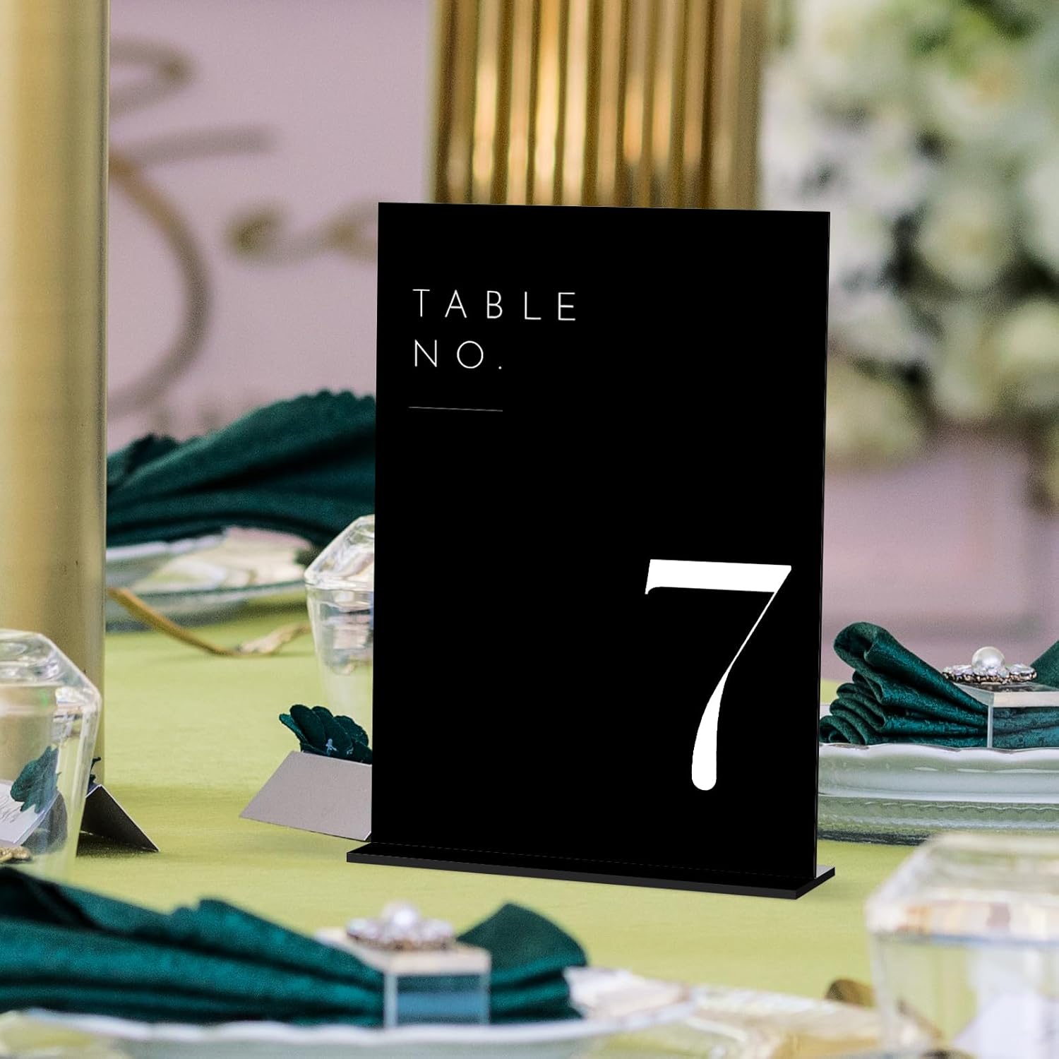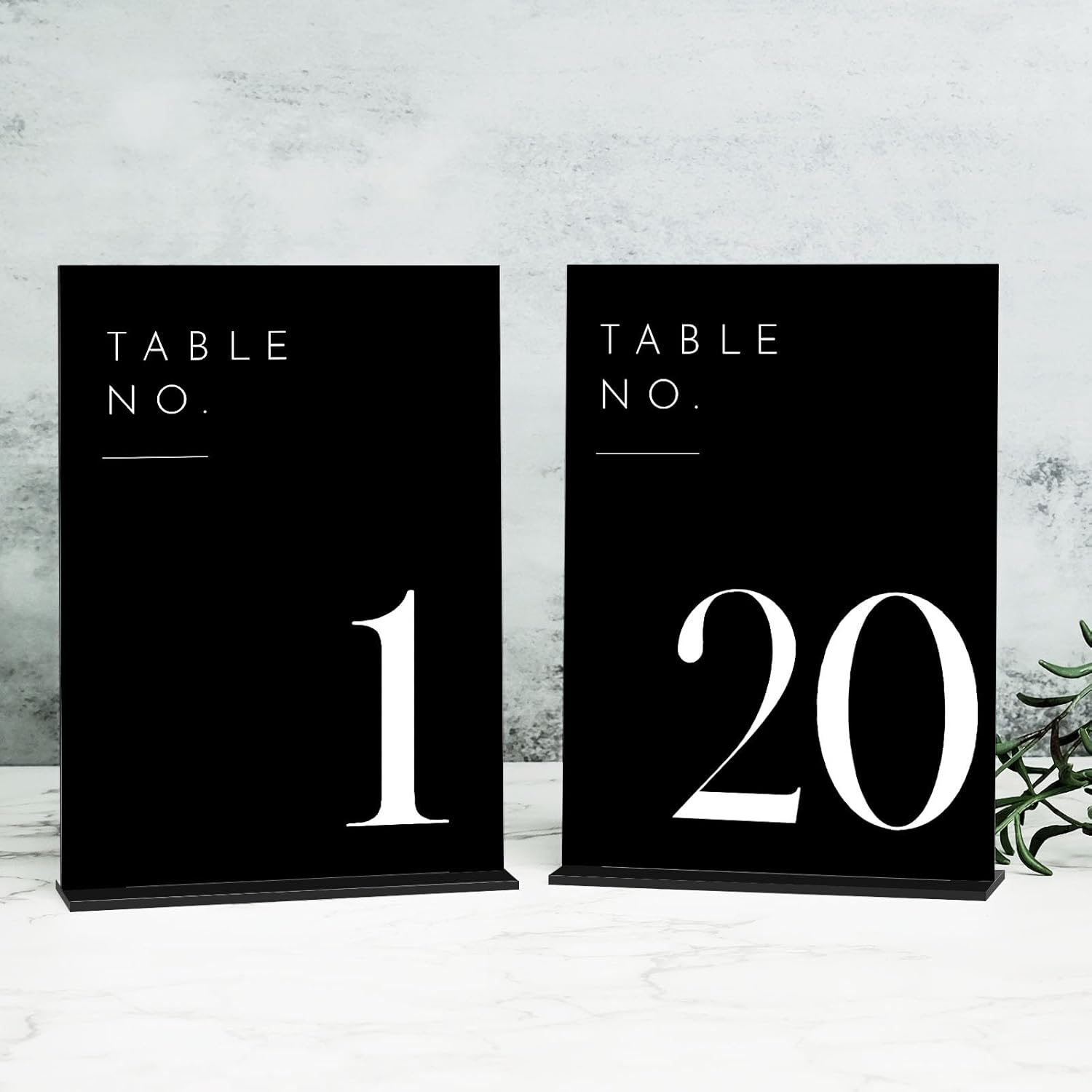 • PREMIUM QUALITY: These black acrylic table numbers with holders are made from high quality black acrylic panels and then printed with white letters in a simple arch design that won't go out of style and will last a long time.