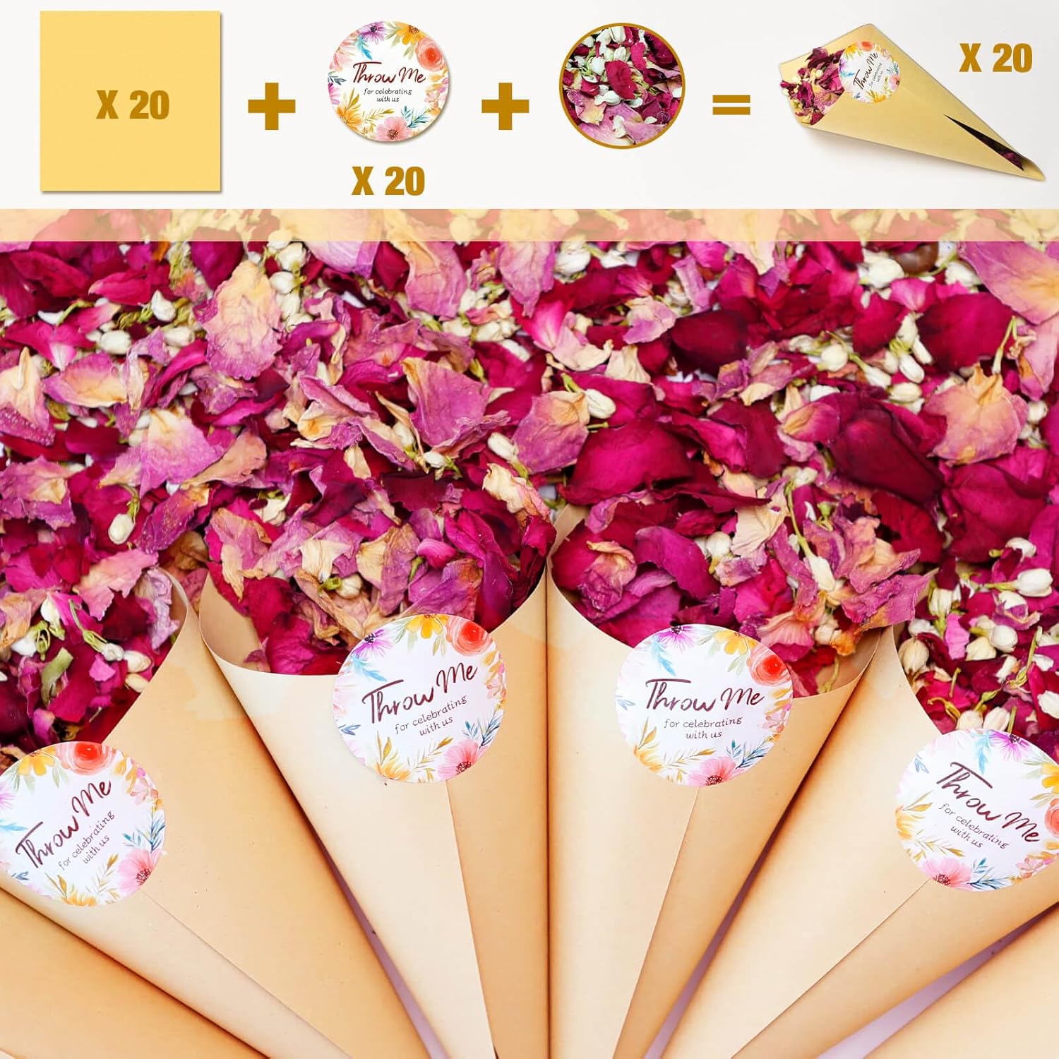 • Perfect Match: Each package contains 2 QT of loose rose petals, 20 pcs paper cones and stickers! Taken together you'll get 20 cups of petals. Whether you need romance or color, our petals make every event memorable.