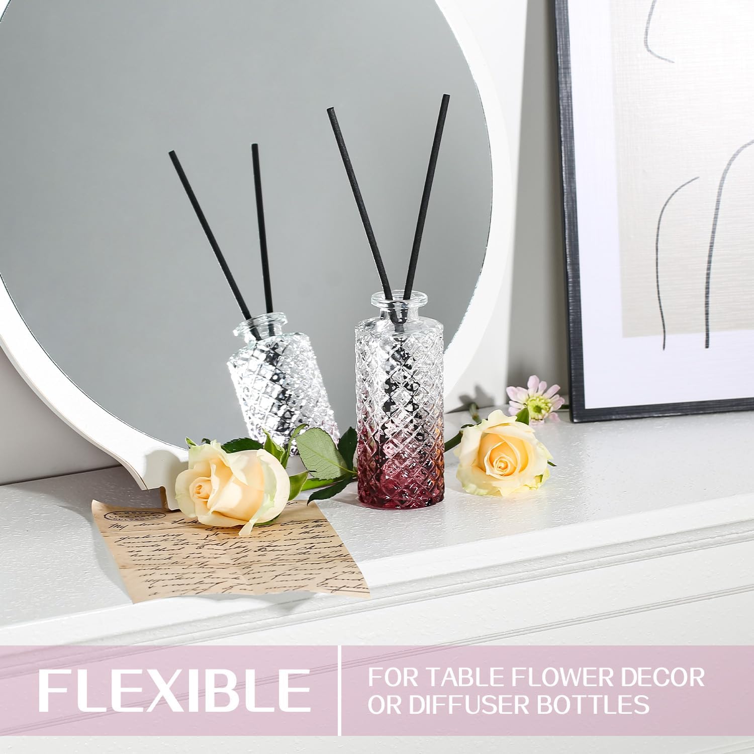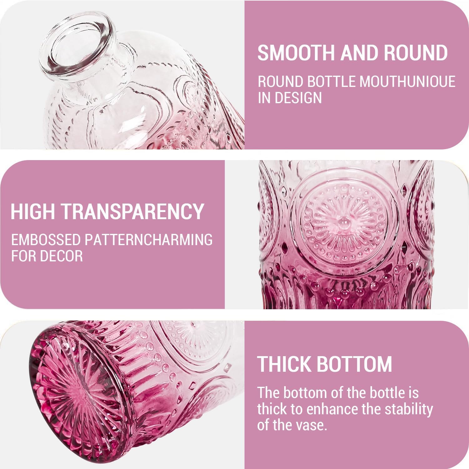 • 🍀【THICKENED MATERIAL】These charming small vases are made of thick and sturdy glass, durable and unbreakable. The patterned finish gives them. a textured look and sparkles in the light. Simply insert a flower stem and fill with water, stones or colored gems.