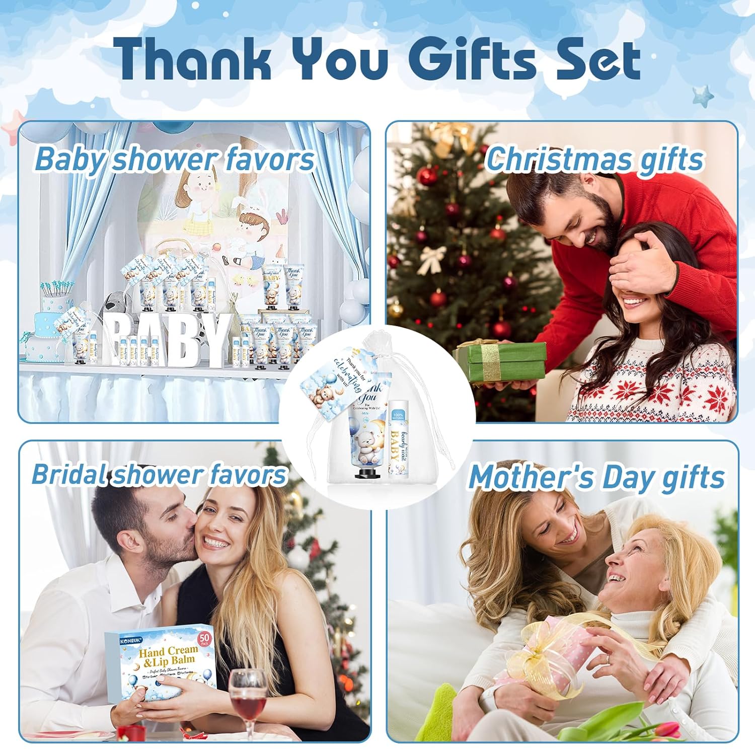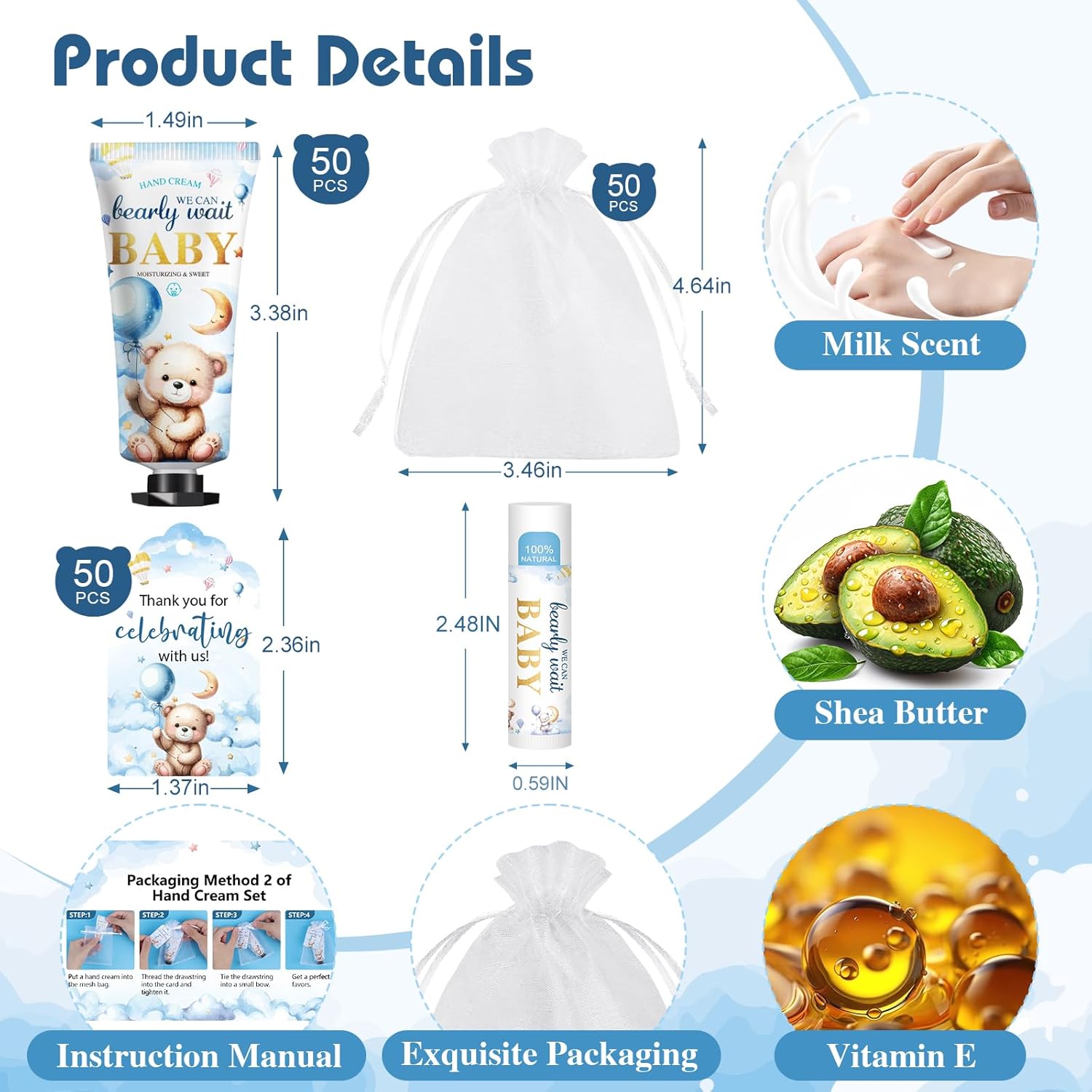 50 Pack Lip Balm and Hand Cream Bulk Gifts Sets, Baby Shower Party Favors and Bridal Shower Favors for Guests with Thank You Card and Organza Gift Bags, Thank You Gifts Bulk, Baby Shower Prizes (Bear)