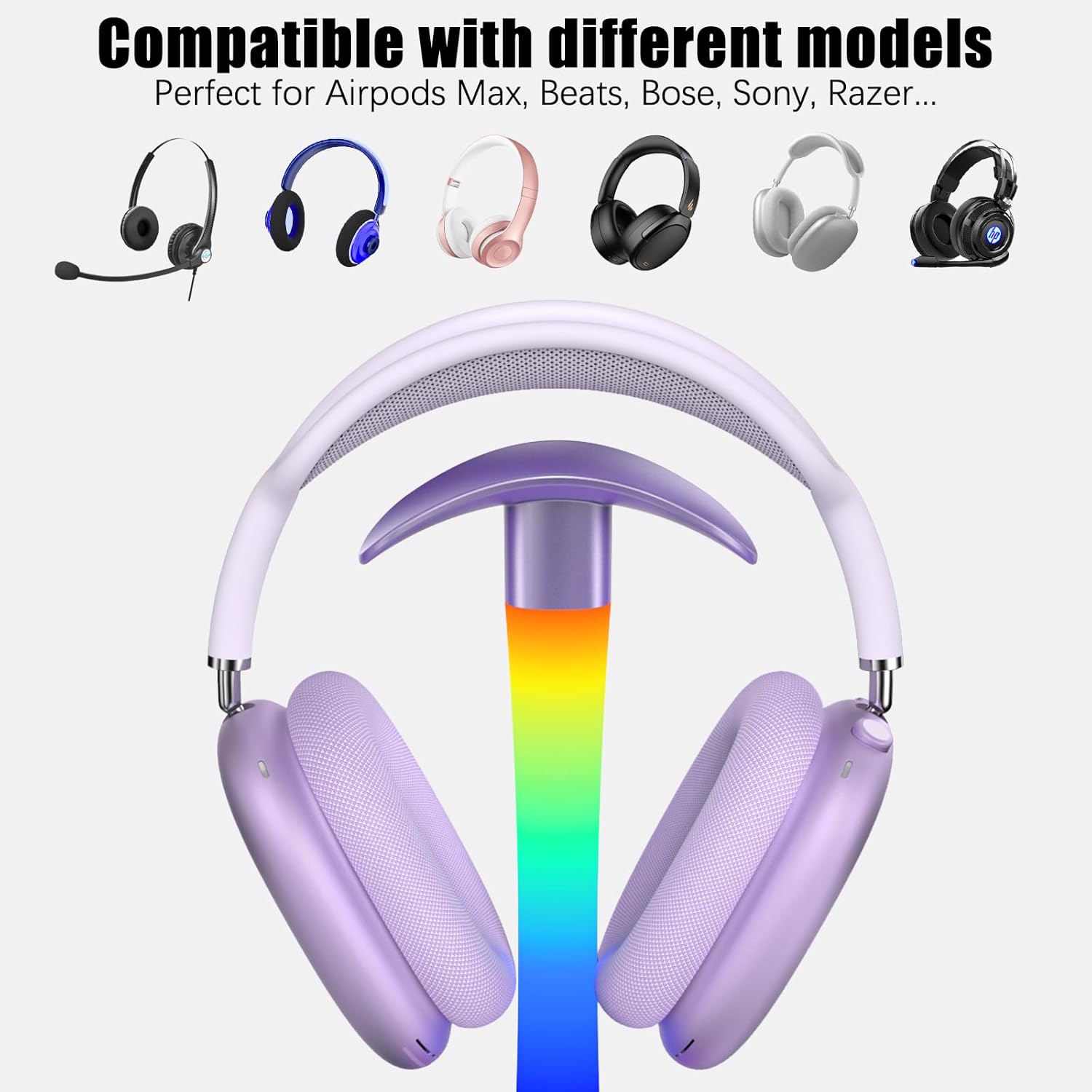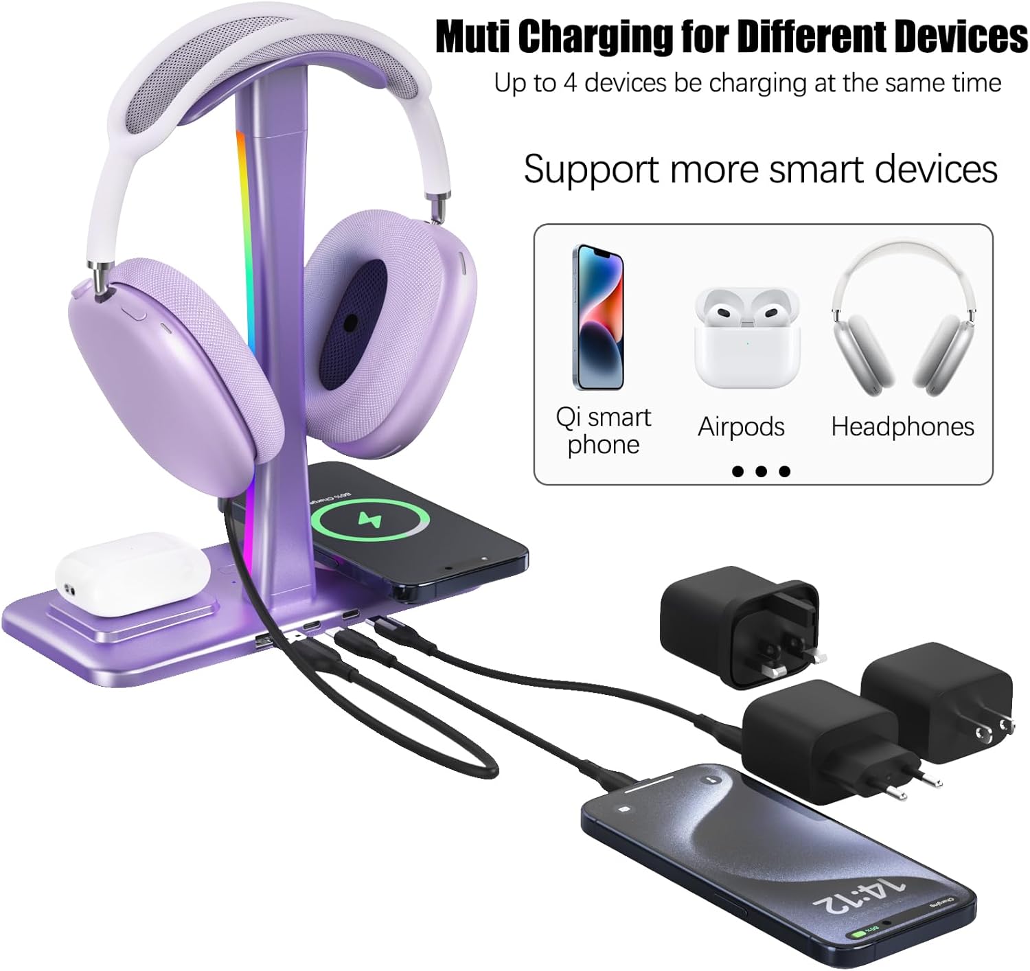 Headphone Stand with Wireless Charger,Gaming Headset Stand with RGB Light Mode,Airpod Max Stander Compatible with Airpod Pro/3/2,iPhone 16/15/14/13/12/11,Gifts for Gamers & Music Lover (Purple)