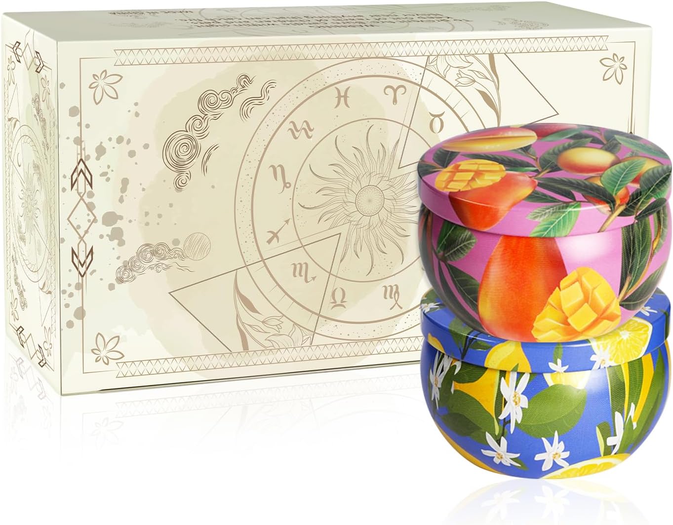 • HOME SCENTED CANDLES: This scented candle gift set includes 2 jars of scented candles: mango and lemon, the natural essential oils will leave you feeling calm, refreshed, and relieved of stress.